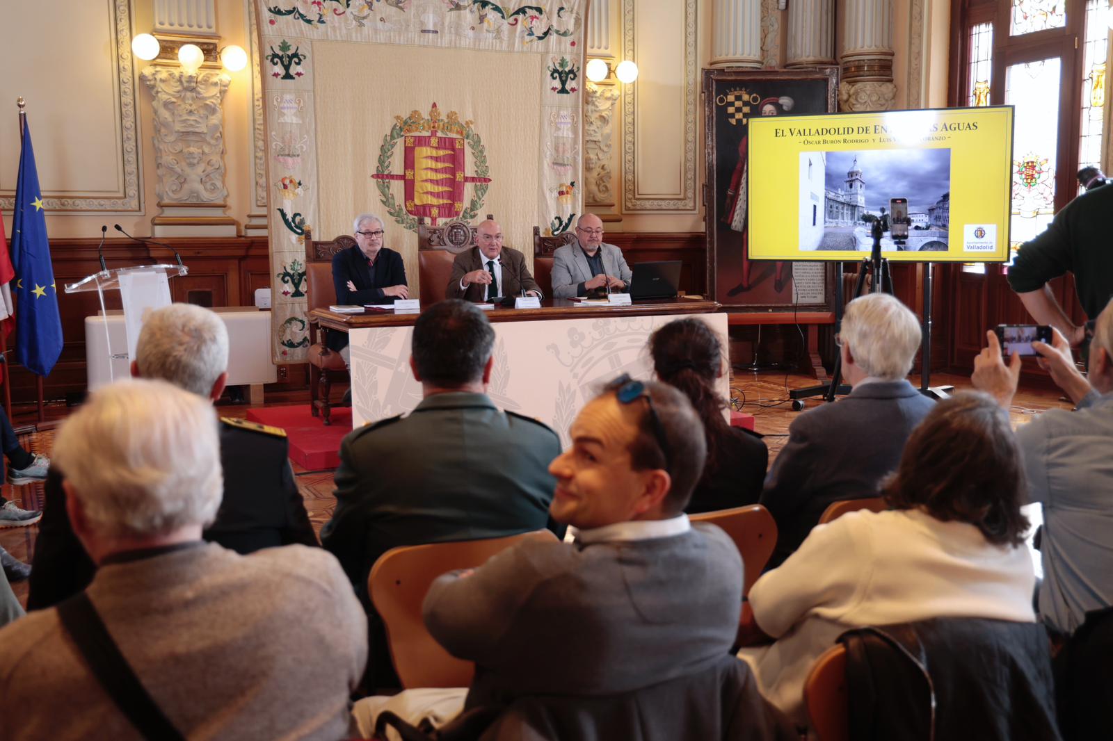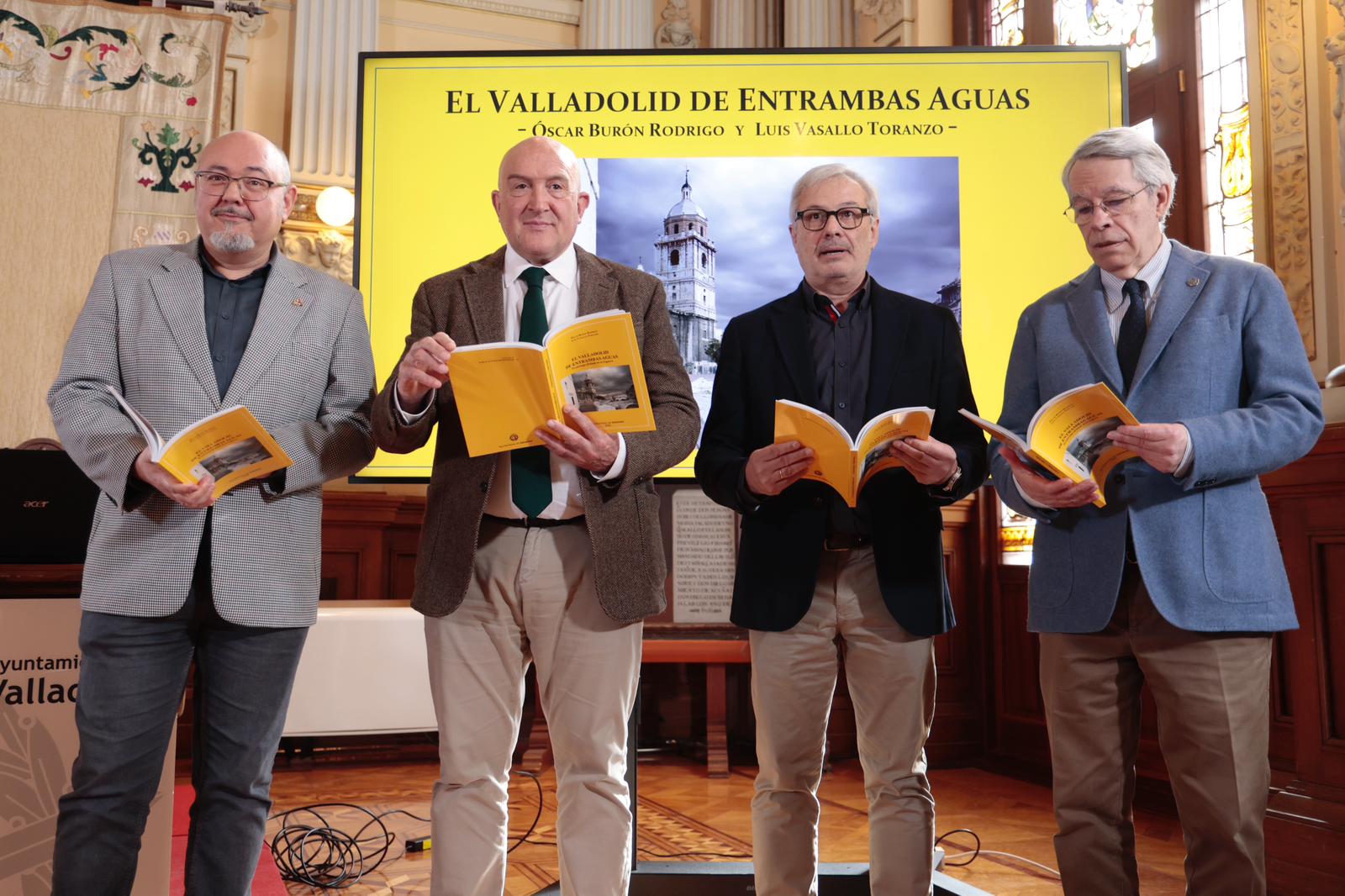 El alcalde de Valladolid, Jesús Julio Carnero, acompañado de los investigadores Óscar Burón Rodrigo y Luis Vasallo Toranzo; y el catedrático de la Universidad de Valladolid Jesús Urrea Fernández, ha participado esta mañana en el acto de presentación de ‘El Valladolid de Entrambas Aguas’, nueva publicación que se integra en la Colección de Publicaciones Municipales con el número 53.
