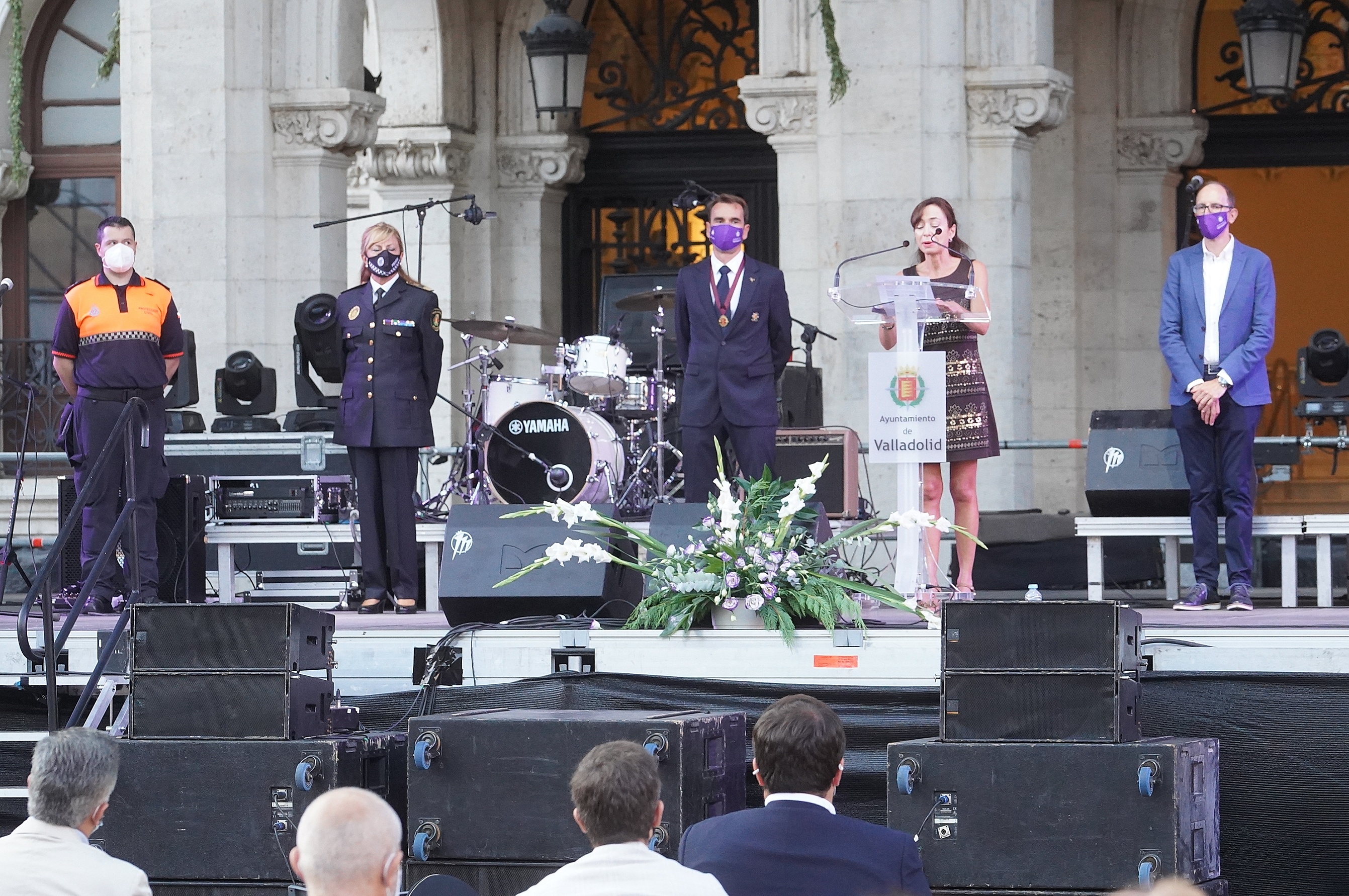 Con el aforo limitado por las medidas de seguridad, miembros de la Corporación Municipal, autoridades de distintas administraciones y representantes de la sociedad vallisoletana asistieron al acto de la Plaza Mayor con la esperanza de que el próximo año sea el de la normalidad absoluta.