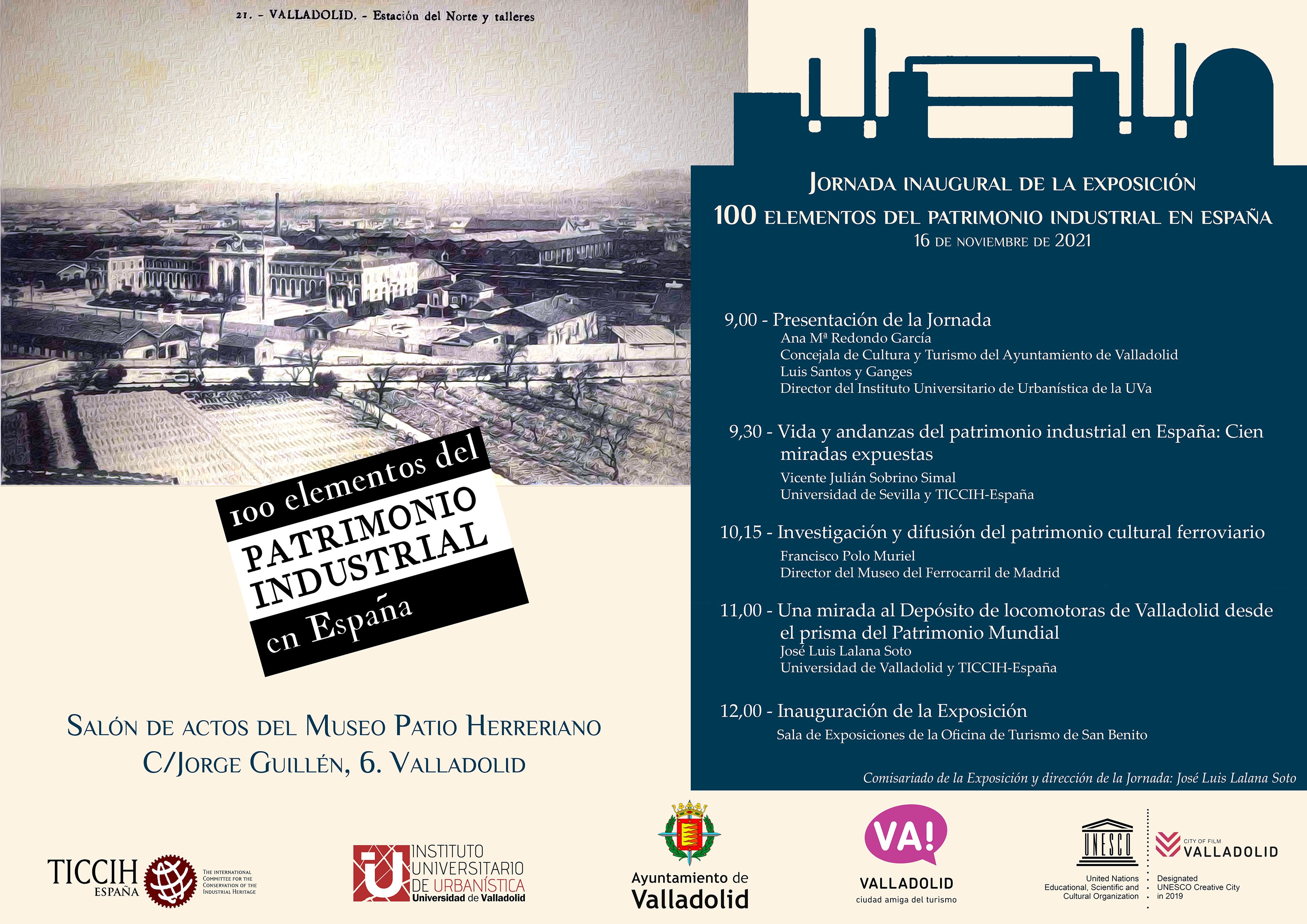 La concejala de Cultura y Turismo, Ana Redondo, ha presentado en el Museo Patio Herreriano la jornada inaugural de la exposición "100 elementos del Patrimonio lndustrial en España. La estación de Norte en Valladolid" que podrá verse en la sala municipal de exposiciones de San Benito del 16 de noviembre de 2021 al 7 de enero 2022. Esta edición de la exposición de los 100 elementos del Patrimonio Industrial de España (TICCIH-España), ha sido organizada por la Concejalía de Cultura y Turismo del Ayuntamiento de Valladolid y el Instituto Universitario de Urbanística de la Universidad de Valladolid y está comisariada por José Luis Lalana.