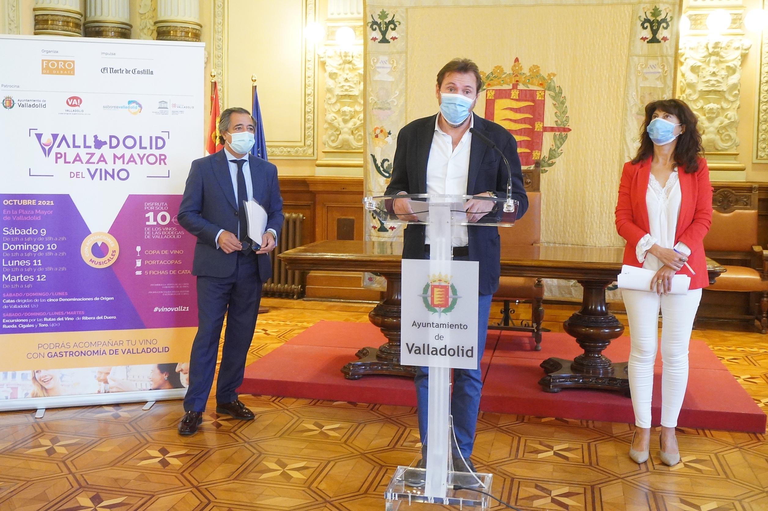 El alcalde de Valladolid, Óscar Puente; la concejala de Cultura y Turismo, Ana Redondo; y Manuel Salgado, director de Foro de Debate en Castilla y León; han presentado la tercera edición del evento "Valladolid. Plaza Mayor del vino" que tendrá lugar los días 9, 10, 11 y 12 de octubre. Durante esos días, la Plaza Mayor se convierte en punto de encuentro de las cinco denominaciones de origen con presencia en la provincia de Valladolid.