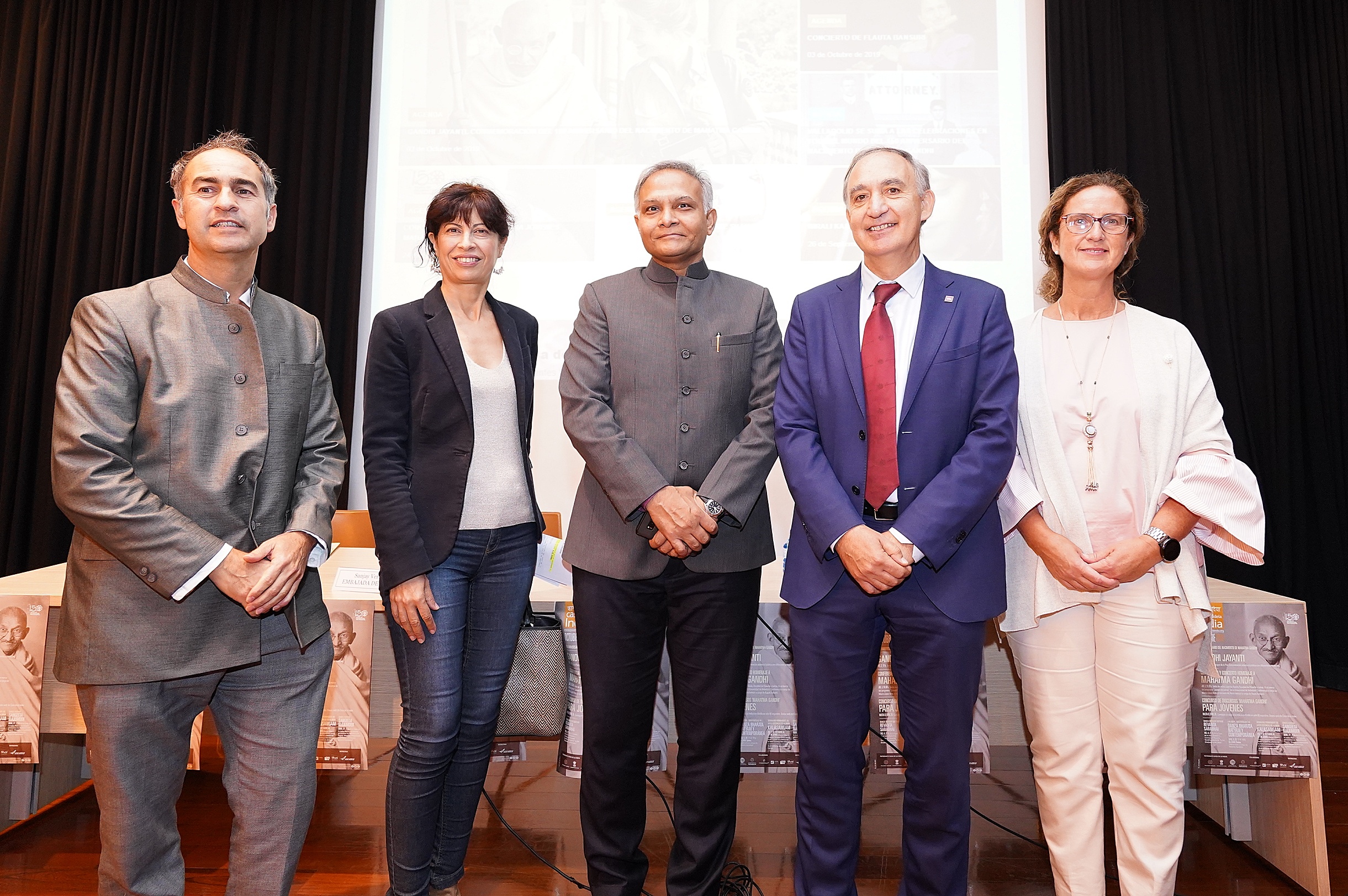 La Casa de la India en Valladolid ha acogido esta mañana la presentación de los eventos organizados con motivo del 150 aniversario del nacimiento de Mahatma Gandhi, a la que han asistido el presidente de la Fundación Casa de la India y rector de la Universidad de Valladolid, Antonio Largo; la concejala de Cultura y Turismo, Ana María Redondo; el embajador de la India, Sanjay Verma; el director de la Casa de la India, Guillermo Rodríguez; y la vicerrectora de Internacionalización de la UVA, Paloma Castro.