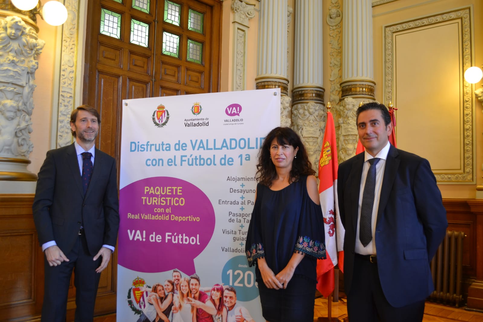 La concejala de Cultura y Turismo, Ana Redondo, acompañada por el presidente del Real Valladolid, Carlos Suárez, así como por Pablo Parrilla, el presidente de la Asociación Vallisoletana de Agencias de Viaje, Carlos Parrilla, han presentado hoy en la Casa Consistorial un paquete turístico ligado a los partidos de fútbol que, dentro de la Primera División acogerá durante esta Liga el Estadio José Zorrilla, y que bajo el nombre de "VA! de Fútbol" comenzará su comercialización de cara al encuentro con el Alavés el próximo 16 de septiembre.