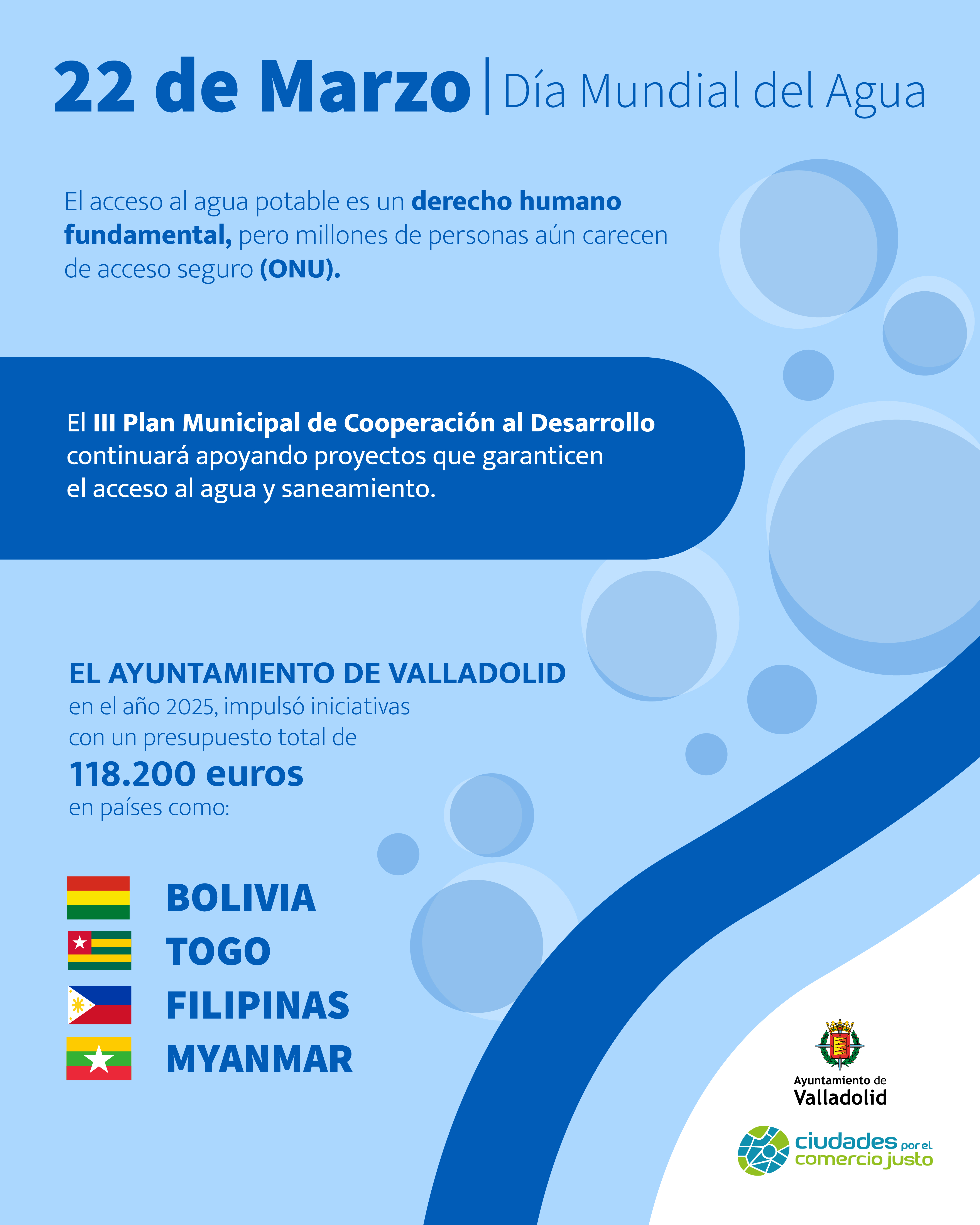 Durante el año 2025, el Ayuntamiento de Valladolid ha destinado 118.200 euros a proyectos relacionados con el agua y saneamiento en 4 países: Bolivia, Togo, Filipinas y Myanmar, orientados a: la instalación de infraestructuras para dotar de agua potable y saneamiento a comunidades y centros específicos; a formación y capacitación en gestión del agua y prácticas de higiene adecuadas, a acciones para la prevención de enfermedades hídricas y a suministrar agua potable de emergencia ante desastres naturales como los ocurridos con los terremotos de Filipinas y Myanmar.