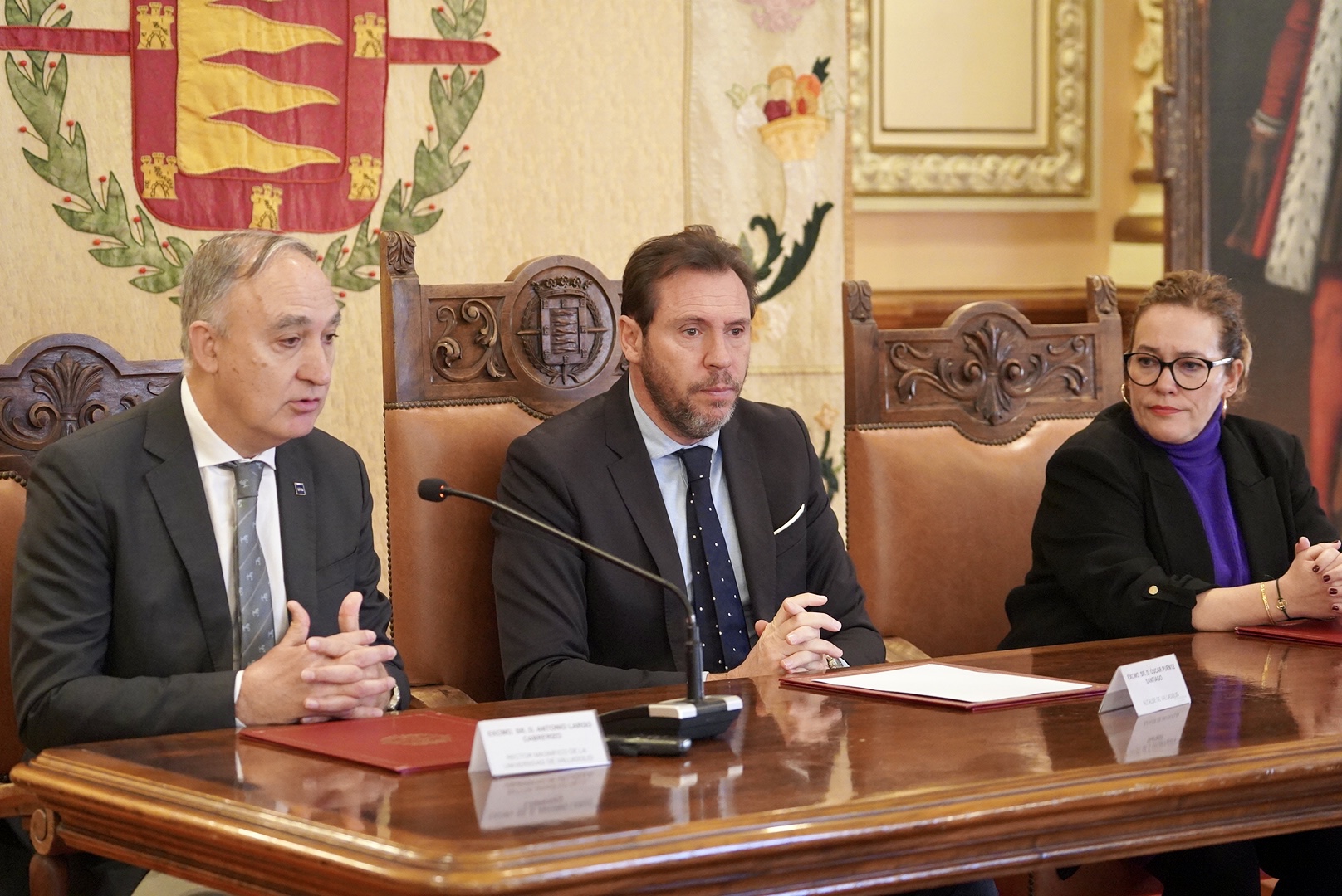 El alcalde, Óscar Puente, acompañado por la concejala de Innovación, Desarrollo Económico, Empleo y Comercio, y el rector de la Universidad de Valladolid, Antonio Largo, han presentado el convenio suscrito entre Ayuntamiento y Universidad con el que refuerzan su alianza con el objetivo de impulsar la modernización y transformación digital y verde del tejido empresarial vallisoletano mediante la incorporación de jóvenes titulados.