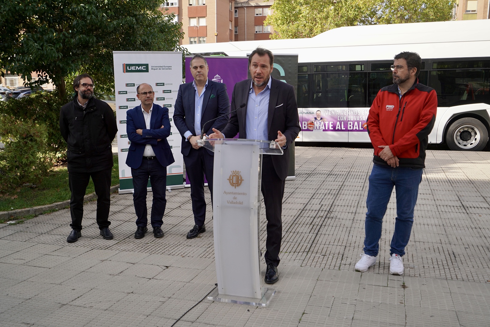 El alcalde de Valladolid, Óscar Puente, el concejal de Movilidad y Espacio Urbano, Luis Vélez, el concejal de Participación Ciudadana y Deportes, Alberto Bustos, el gerente de AUVASA, Álvaro Fernández, y el director general del Club de Baloncesto Ciudad de Valladolid, Saúl Hernández, han presentado el acuerdo suscrito entre AUVASA y el club deportivo que ha quedado reflejado en una foto junto con los jugadores y un autobús articulado rotulado para el evento y promoción del convenio.
