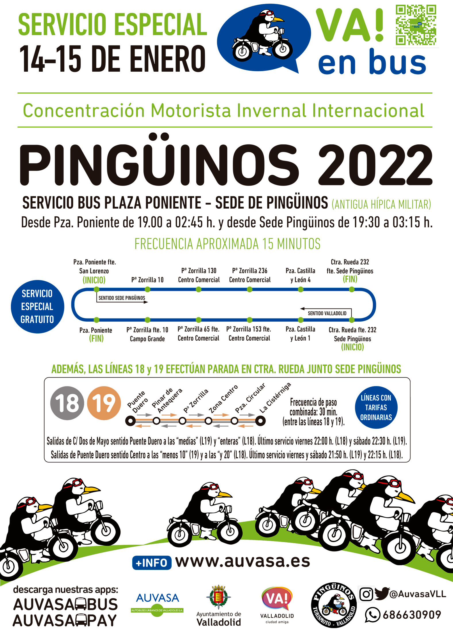 La concentración motera de Pingüinos se celebra del 13 al 16 de enero de 2022, en el término municipal de Valladolid, en la cual suele registrarse una asistencia cercana a las 40.000 personas. La celebración de este evento lleva aparejada la realización del servicio lanzadera de Pingüinos, por parte de AUVASA, durante el viernes 14 y el sábado 15 de enero de 2022, al objeto de conectar la ciudad de Valladolid con la sede de la concentración.