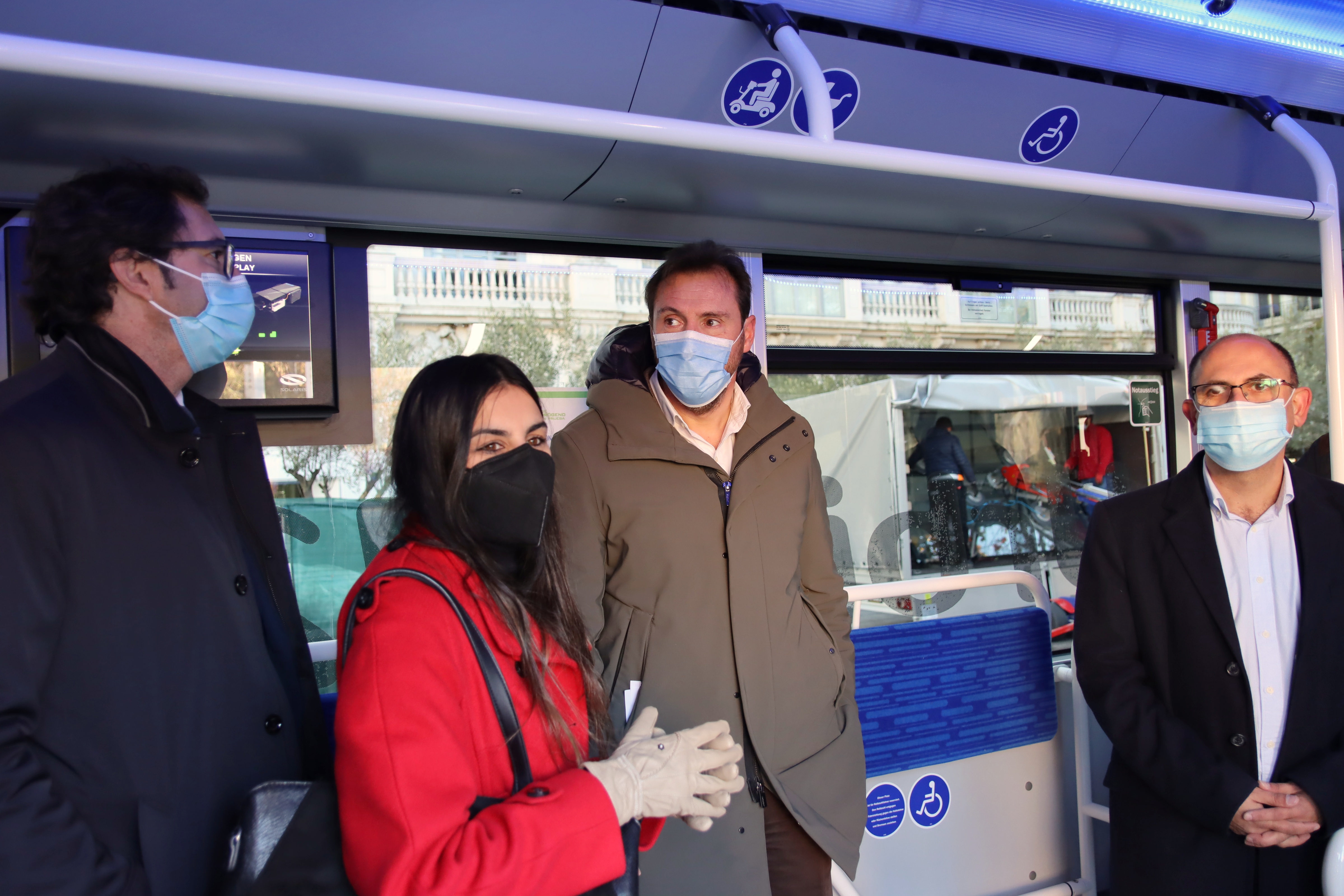 El alcalde, Oscar Puente, junto con el Concejal de Movilidad y Espacio Urbano, Luis Vélez, y el gerente de AUVASA Álvaro Fernández, han comprobado el funcionamiento del autobús propulsado por hidrógeno cedido por SOLARIS, y que se encuentra estos días en pruebas en la ciudad.