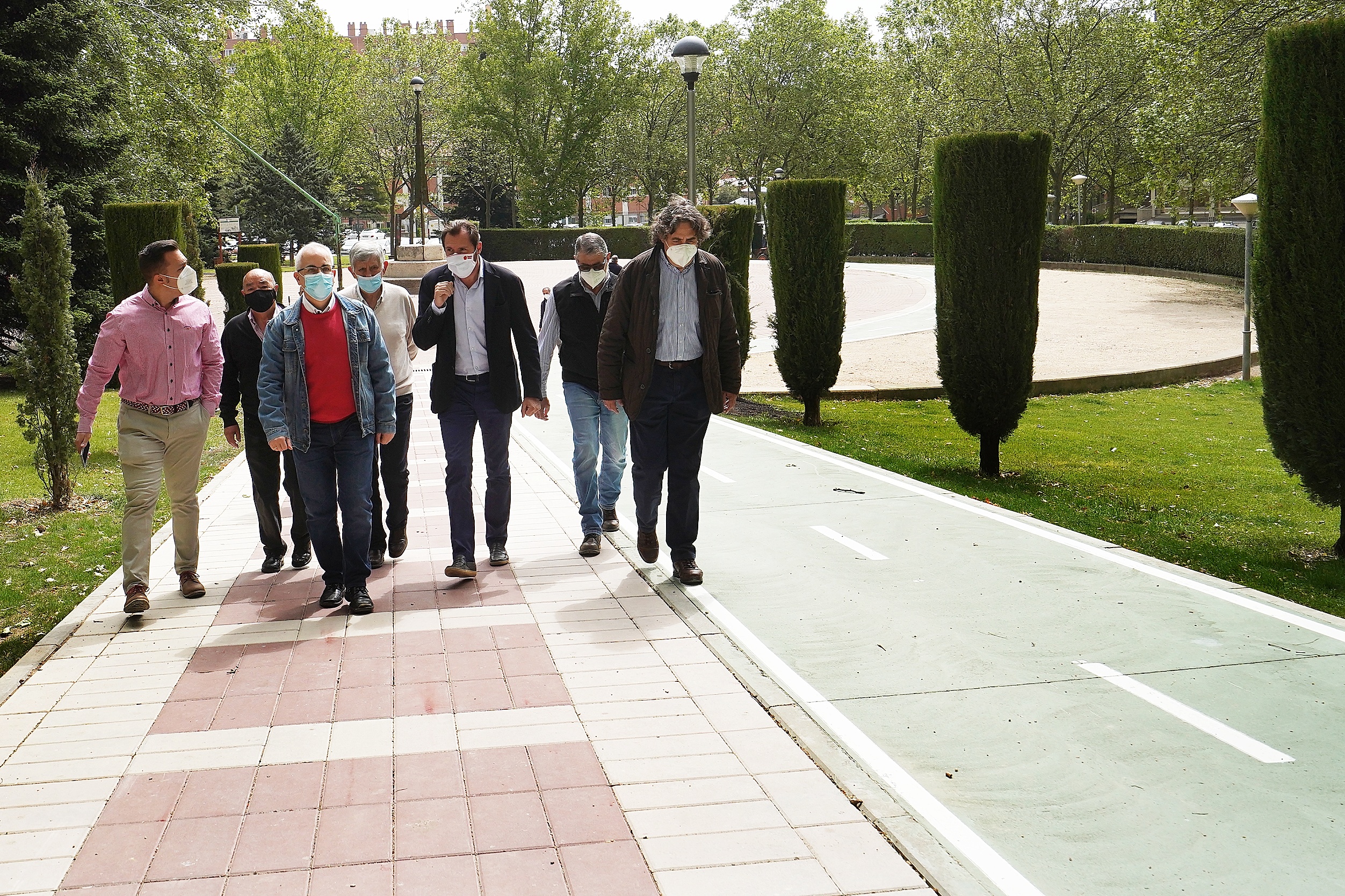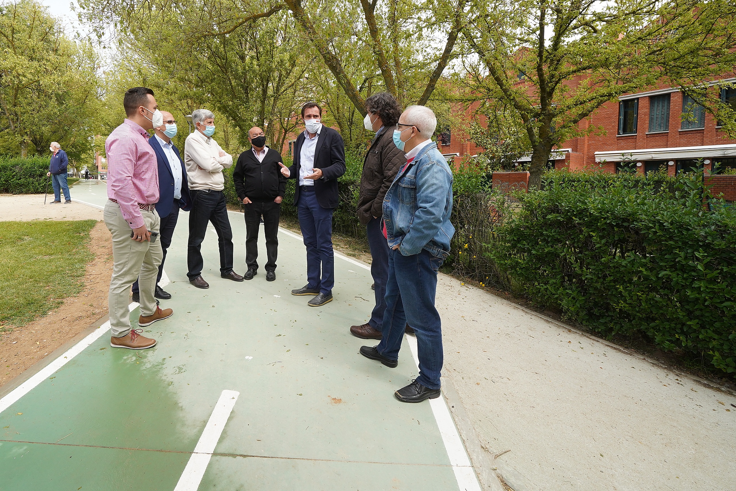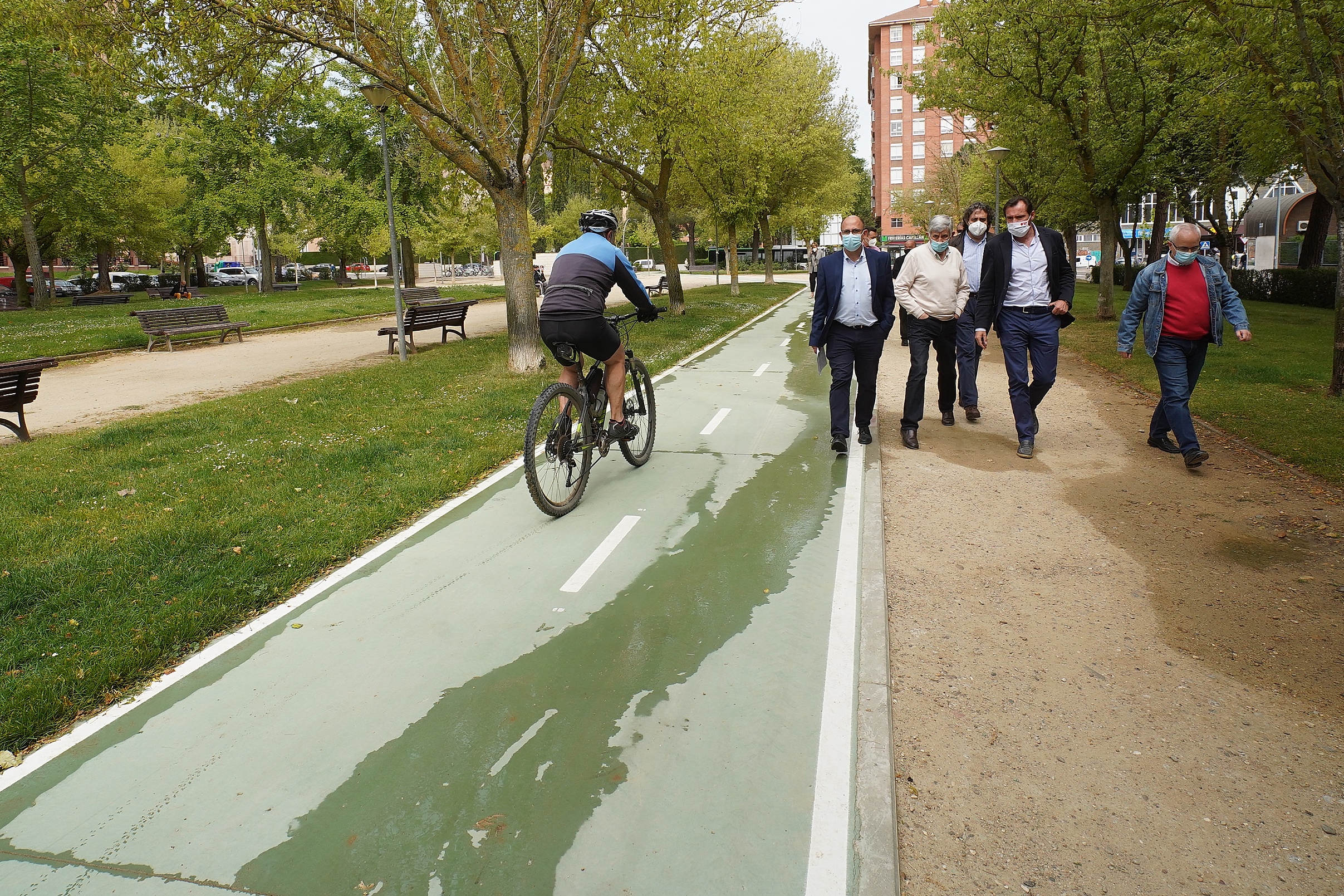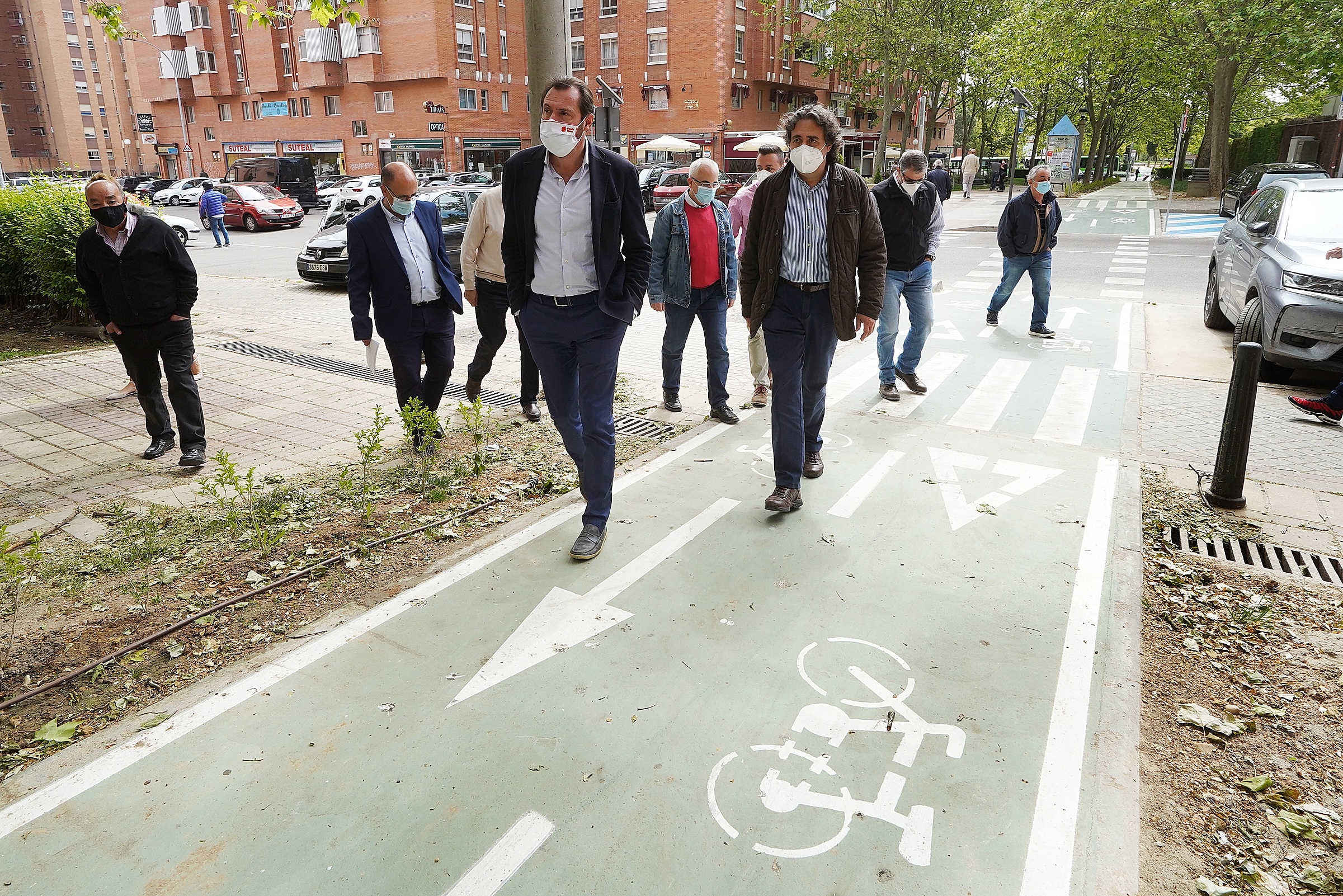 El alcalde, Oscar Puente, junto con el concejal de Movilidad y Espacio Urbano, Luis Vélez, acompañados por técnicos municipales han visitado las obras ejecutadas y concluidas de un tramo de carril bici en el barrio de Parquesol, una actuación aprobada en los Presupuestos Participativos.