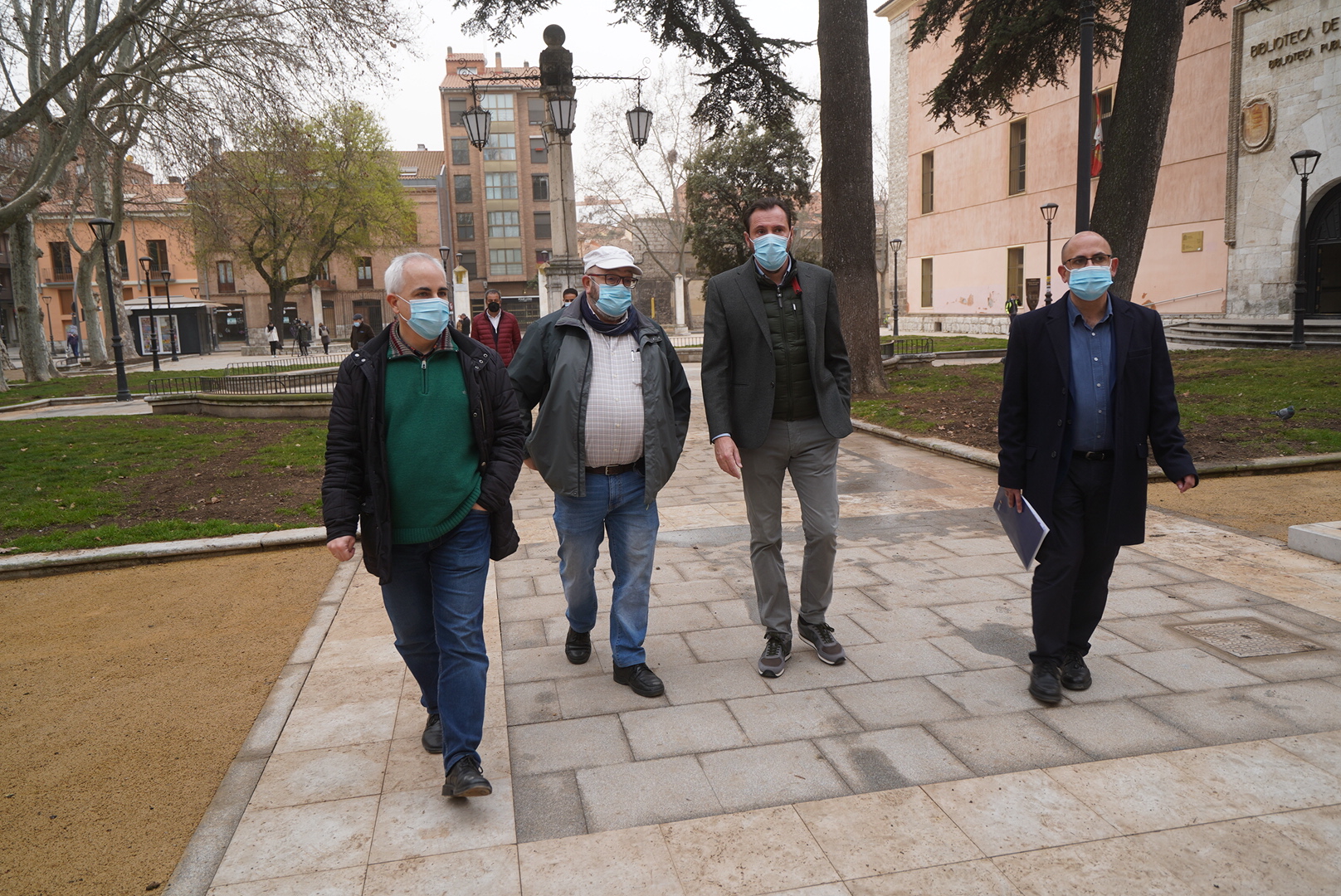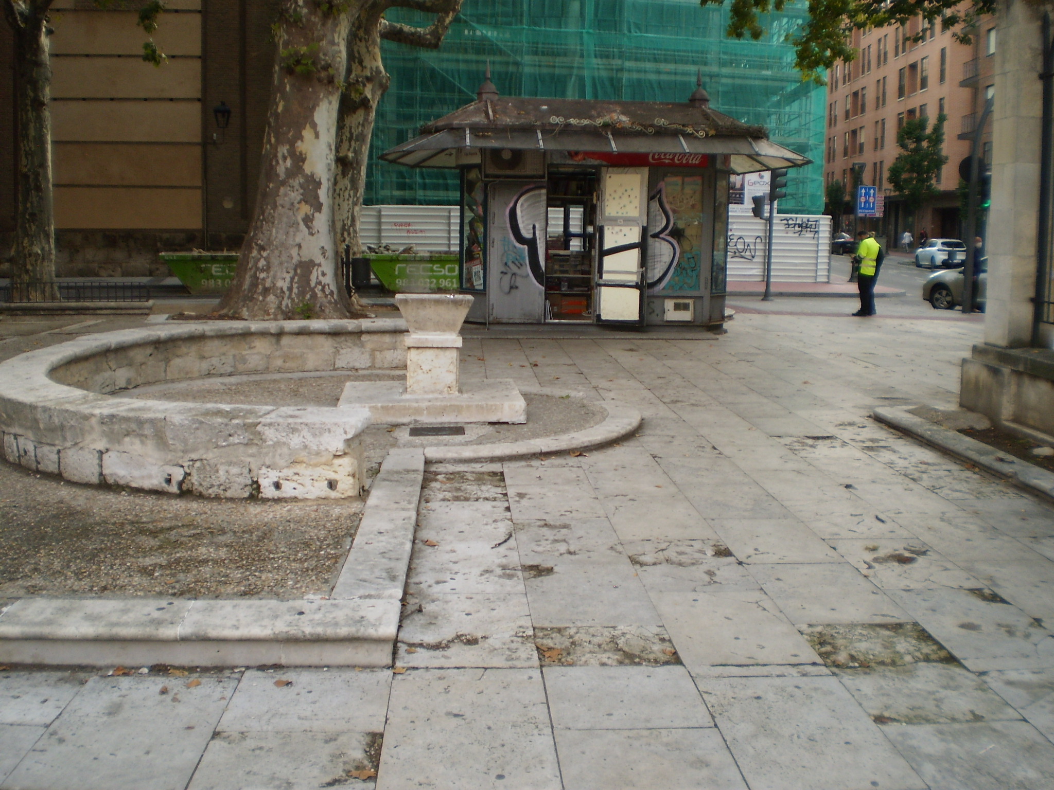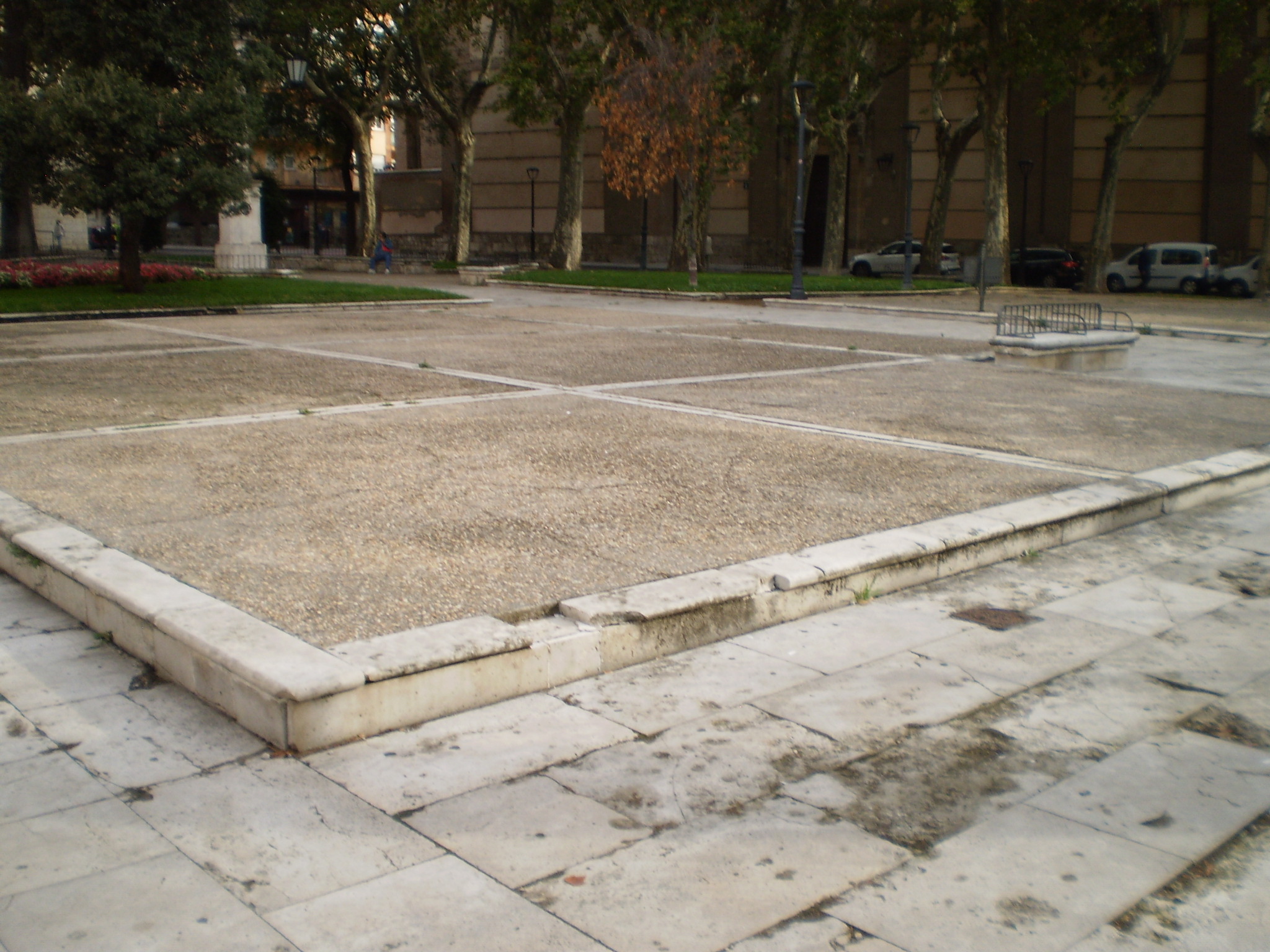 Por tanto, además del preceptivo control arqueológico, resultaba obligado el empleo de materiales nobles en particular en la pavimentación. A tal efecto se han utilizado mayoritariamente losas de granito por su mayor resistencia, y en menor medida, cenefas con losas de piedra caliza, eso sí, de menor dimensión que las preexistentes para garantizar un mejor comportamiento. Se ha mantenido la acera de caliza contigua a la biblioteca, dado su buen estado, y se han recuperado al máximo y recolocado los bordillos y albardillas calizos en los perímetros de parterres.
