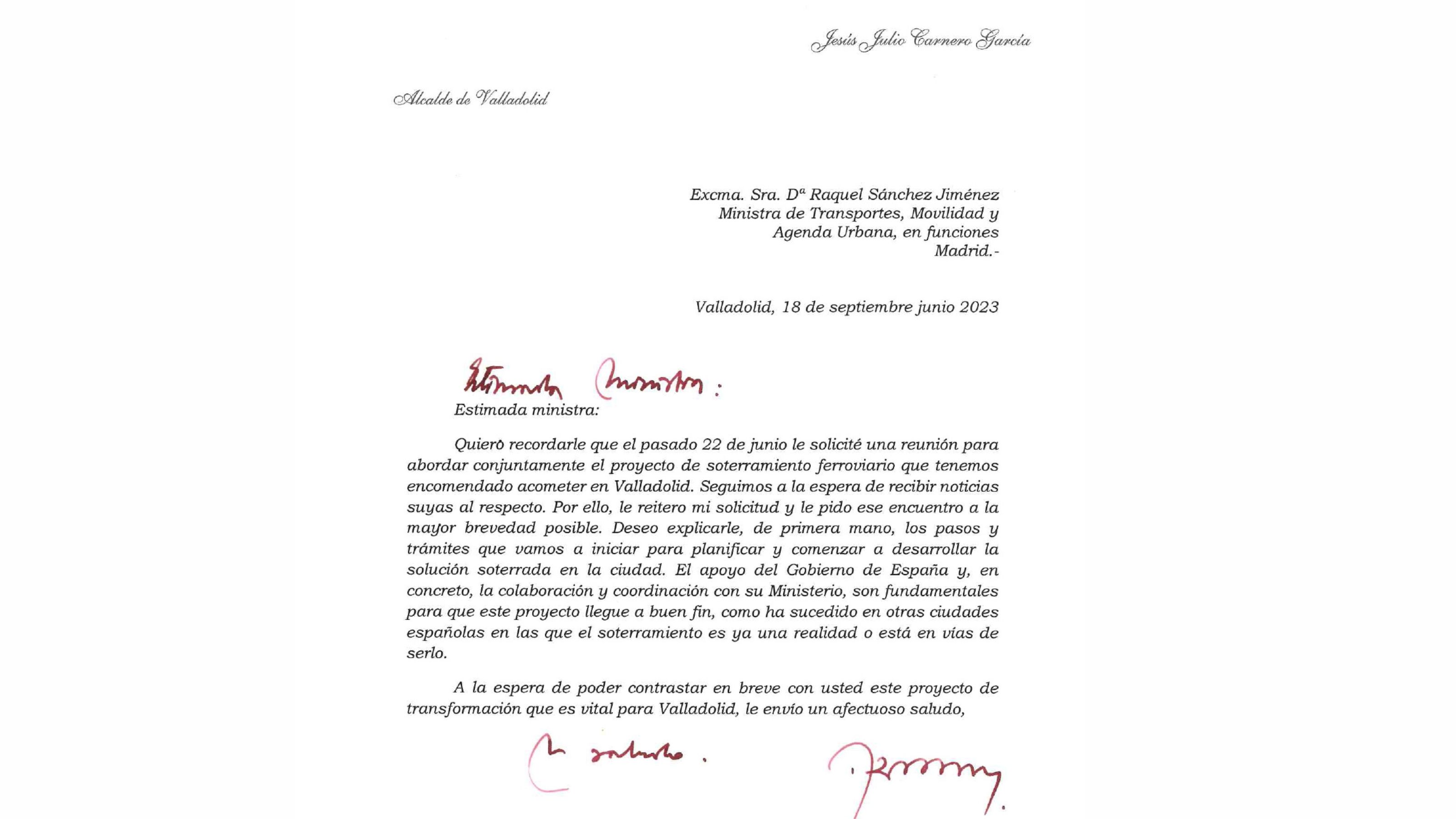 A este respecto, el alcalde, Jesús Julio Carnero, ha reiterado por carta a la ministra de Transportes, Movilidad y Agenda Urbana en funciones, Raquel Sánchez Jiménez, un encuentro presencial al objeto de abordar el tema del soterramiento, para poder discutir la forma de reorientar y llevar a término este proyecto, puesto que aún no se ha obtenido respuesta alguna tras la primera petición formal por este mismo método nada más tomar posesión, en el mes de junio.