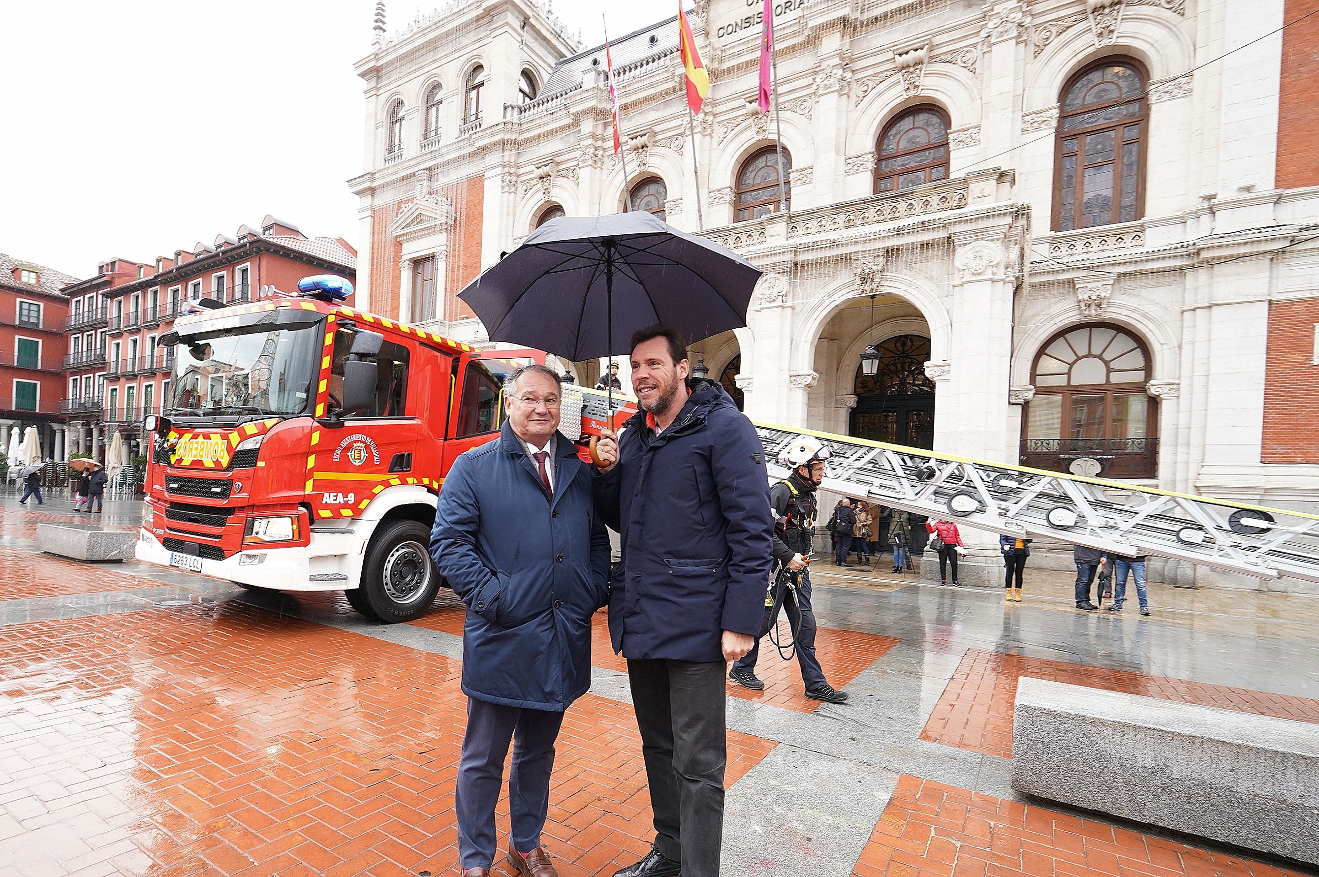 El alcalde, Óscar Puente, acompañado del concejal de Salud Pública y Seguridad Ciudadana, Antonio Otero, ha presentado en la Plaza Mayor la última inversión del Ayuntamiento de Valladolid para mejorar el servicio de Extinción de Incendios, Salvamento y Protección Civil: una autoescala con un valor de casi un millón de euros, capaz de desplegarse a 39 metros de altura.