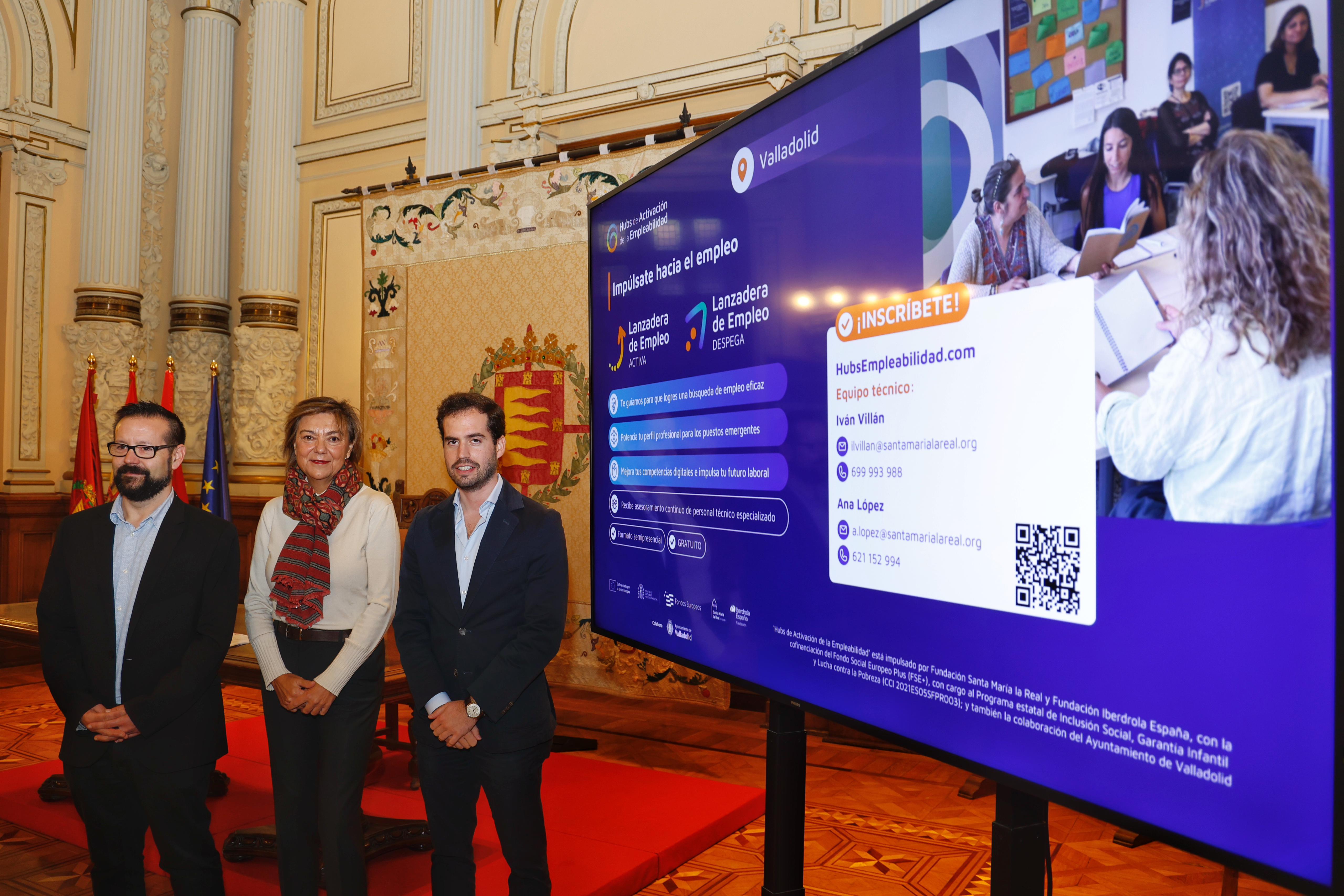 El concejal de Personas Mayores, Familia y Servicios Sociales del Ayuntamiento de Valladolid, Rodrigo Nieto, acompañado por Álvaro Retortillo, director general de la Fundación Santa María la Real, y Teresa Rodríguez de Tembleque, responsable de Acción Social y Formación e Investigación de la Fundación Iberdrola España, ha presentado esta mañana un convenio de colaboración que permitirá impulsar el programa ‘Hubs de Activación de la Empleabilidad’ en la ciudad.