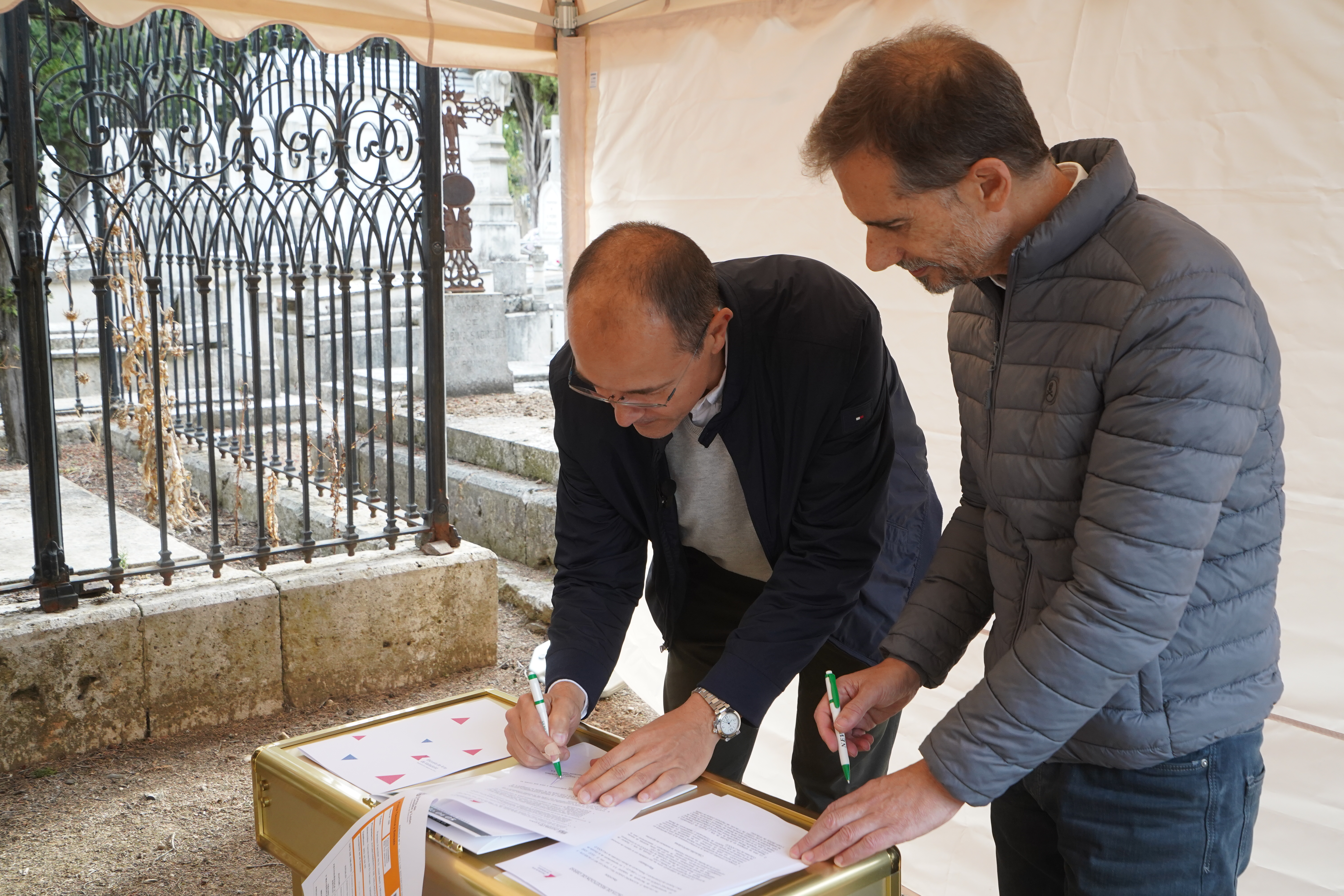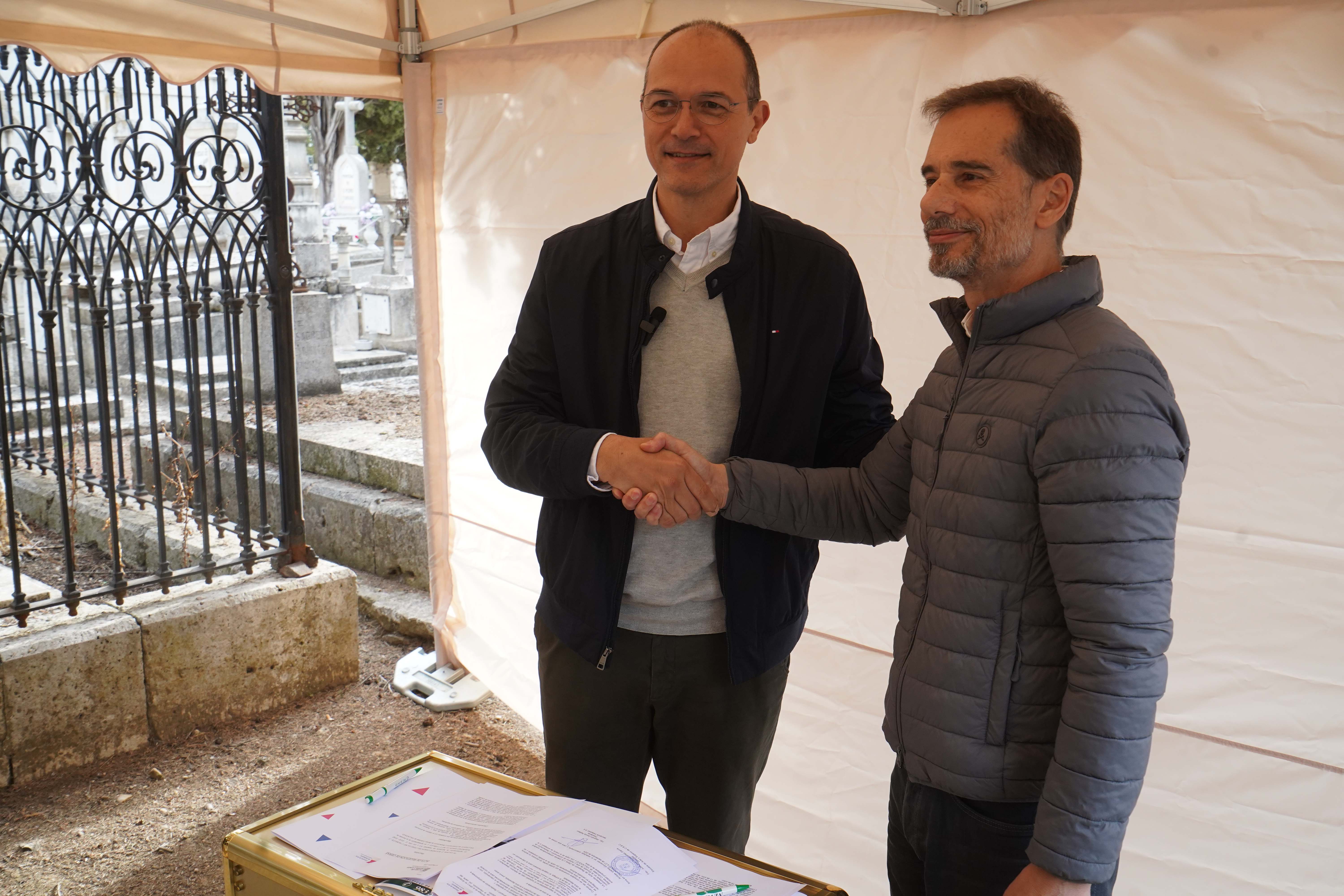 El concejal de Medio Ambiente, Alejandro García Pellitero, como presidente de Necrópolis Valladolid S.A. (NEVASA), ha firmado hoy un convenio de colaboración con la Escuela de Arte y Superior de Conservación y Restauración de Bienes Culturales, representada en su director, Julio Ruiz Sánchez, con el objetivo de promover la conservación del patrimonio del cementerio de ‘El Carmen’.