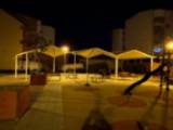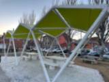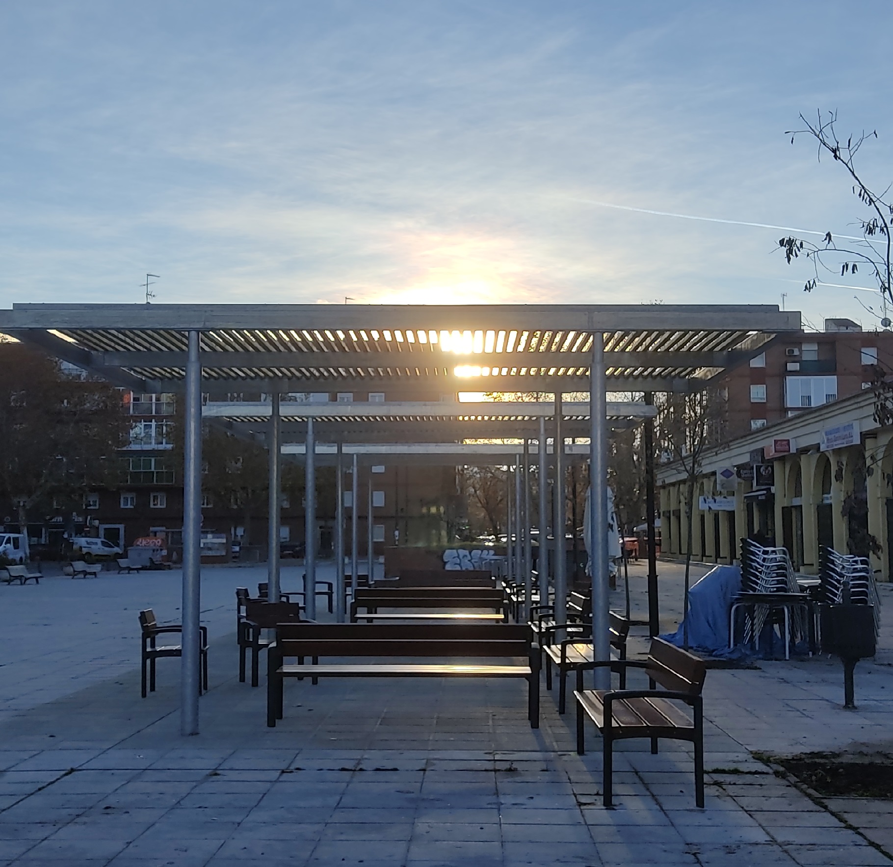 En el caso de la Plaza de la Danza, se han ejecutado dos pérgolas o marquesinas livianas con estructura de acero galvanizado y cubiertas con un emparrillado de listones de madera de pino con tratamiento autoclave. Bajo cada una de ellas se han instalado dos bancos y cuatro sillas que generan una zona estancial que recibirá sombra durante un cierto tiempo del día. Su ubicación próxima a los bancos corridos de las zonas ajardinadas de la zona oeste de la plaza, responde a la idea de crear junto con ellos una zona estancial y respetar la zona central, más de paso, para eventuales actuaciones en el templete existente, y para juegos infantiles de pelota, patinaje, etc…