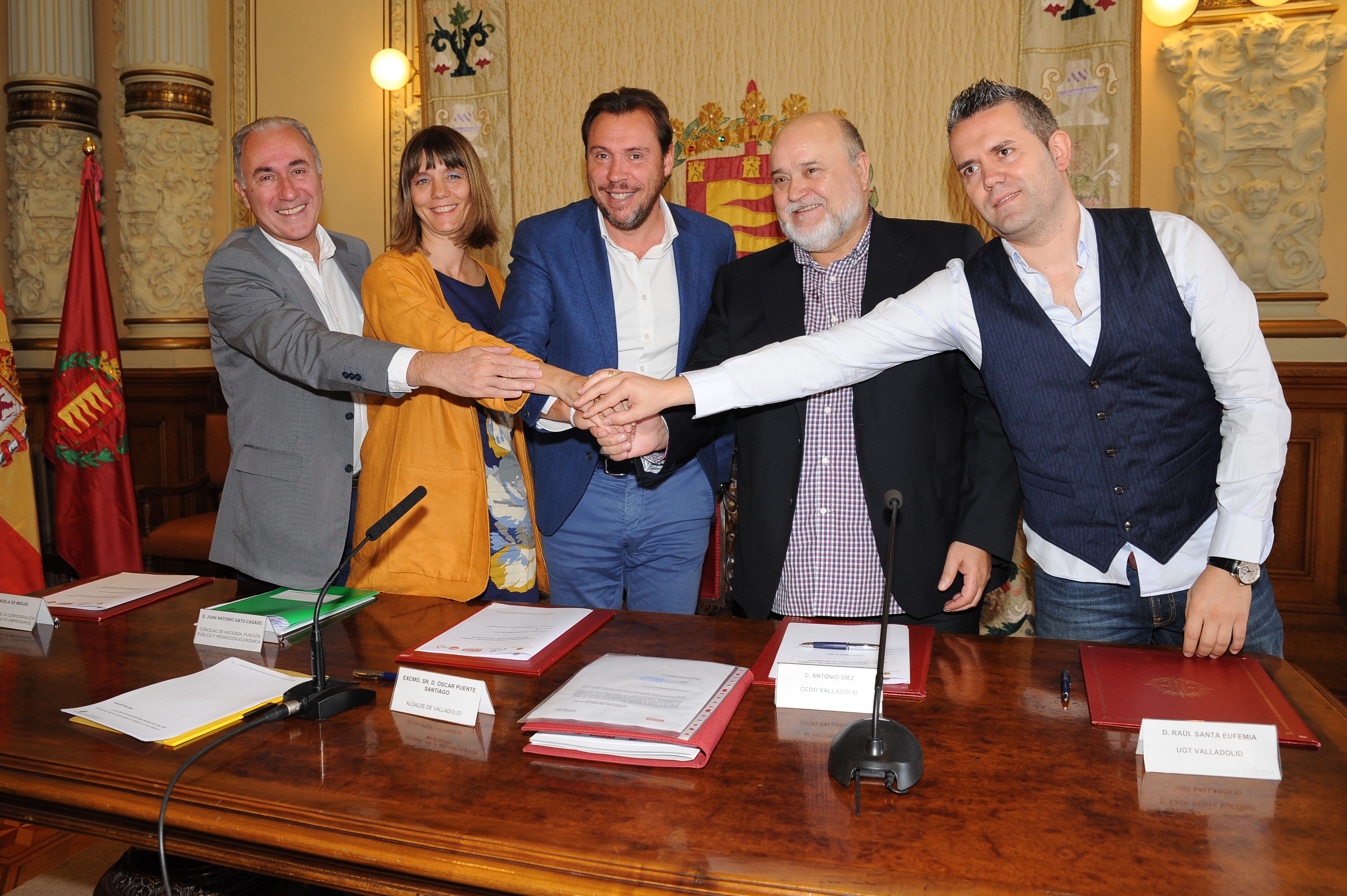 El alcalde de Valladolid, Óscar Puente; la presidenta de la Confederación Vallisoletana de Empresarios, Ángela de Miguel Sanz; el delegado provincial de la Unión Sindical de Comisiones Obreras de Valladolid, Antonio Díez Méndez; y el secretario de política sindical, industrial y empleo de la Unión General de Trabajadores de Valladolid, Raúl Santa Eufemia Rodríguez, han firmado este lunes el acuerdo para la constitución del Consejo del Diálogo Social de la ciudad de Valladolid.