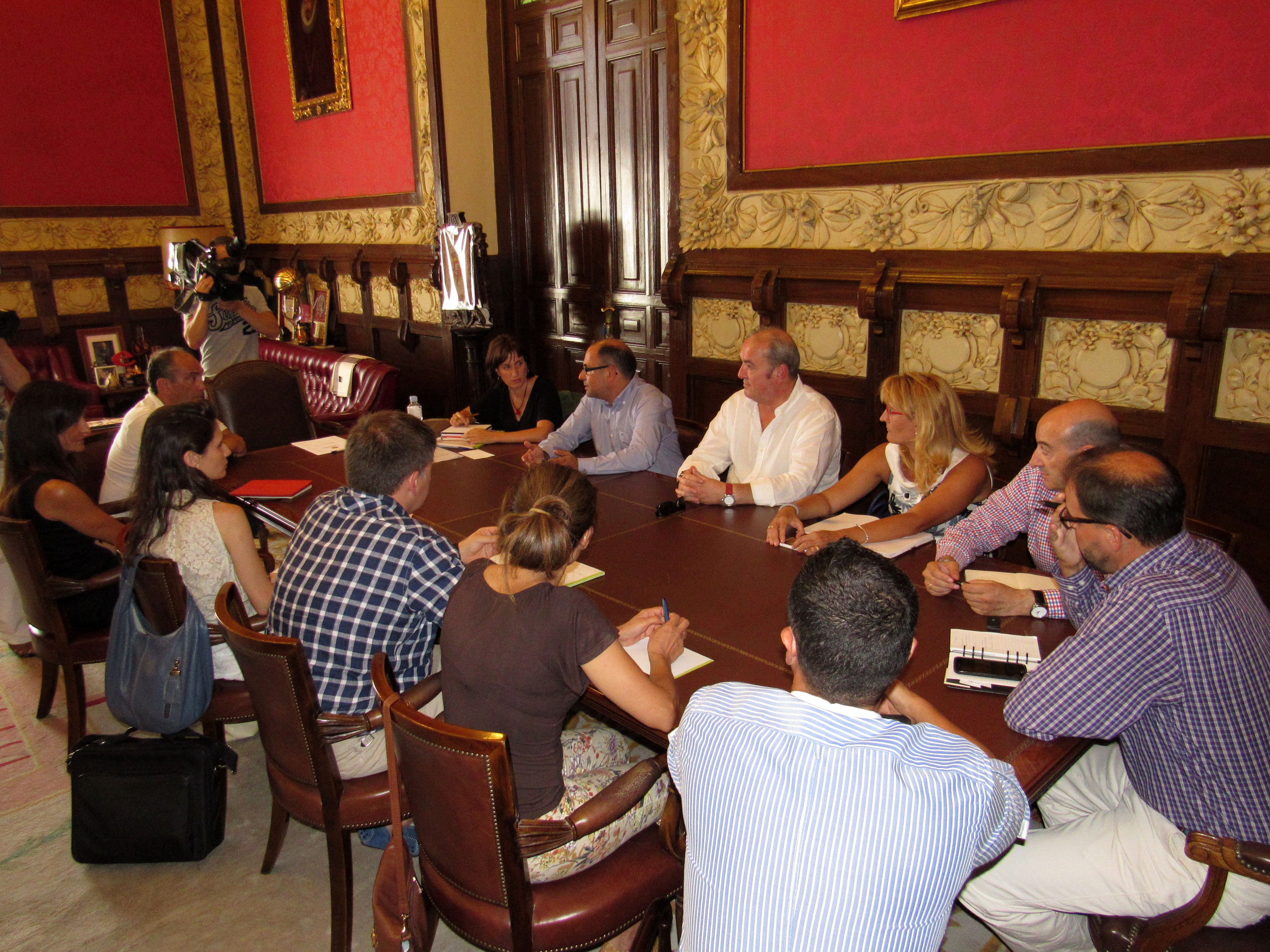 El alcalde de Valladolid, Oscar Puente, y los responsables de las Áreas de Movilidad, Luis Vélez, y Medio Ambiente, María Sánchez, junto a varios técnicos de esos departamentos, mantuvieron un encuentro este jueves con los industriales, que una vez finalizada la obra del edificio, y a la espera de que finalice la remodelación interior, buscan soluciones a la escasez de aparcamiento en la zona, que facilite el acceso a quienes acudan al mercado.