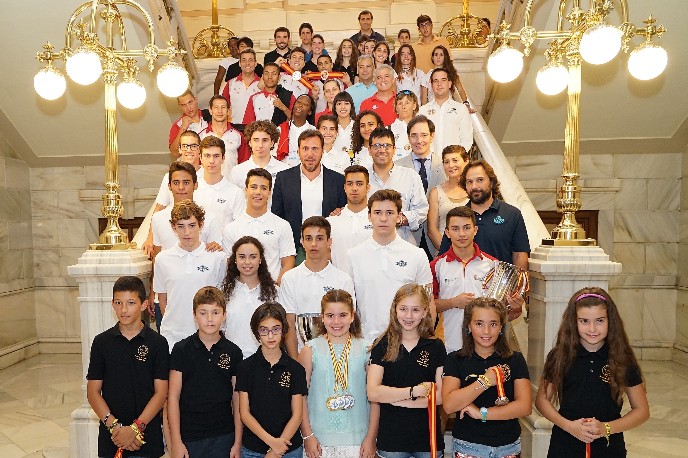El alcalde de Valladolid, Oscar Puente, y el concejal de Deportes, Alberto Bustos, ofrecieron este jueves una recepción en la Casa Consistorial a diversos equipos y deportistas que recientemente han conseguido campeonatos de España en su especialidad, así como a un tirador de esgrima, también vallisoletano, campeón del Mundo.