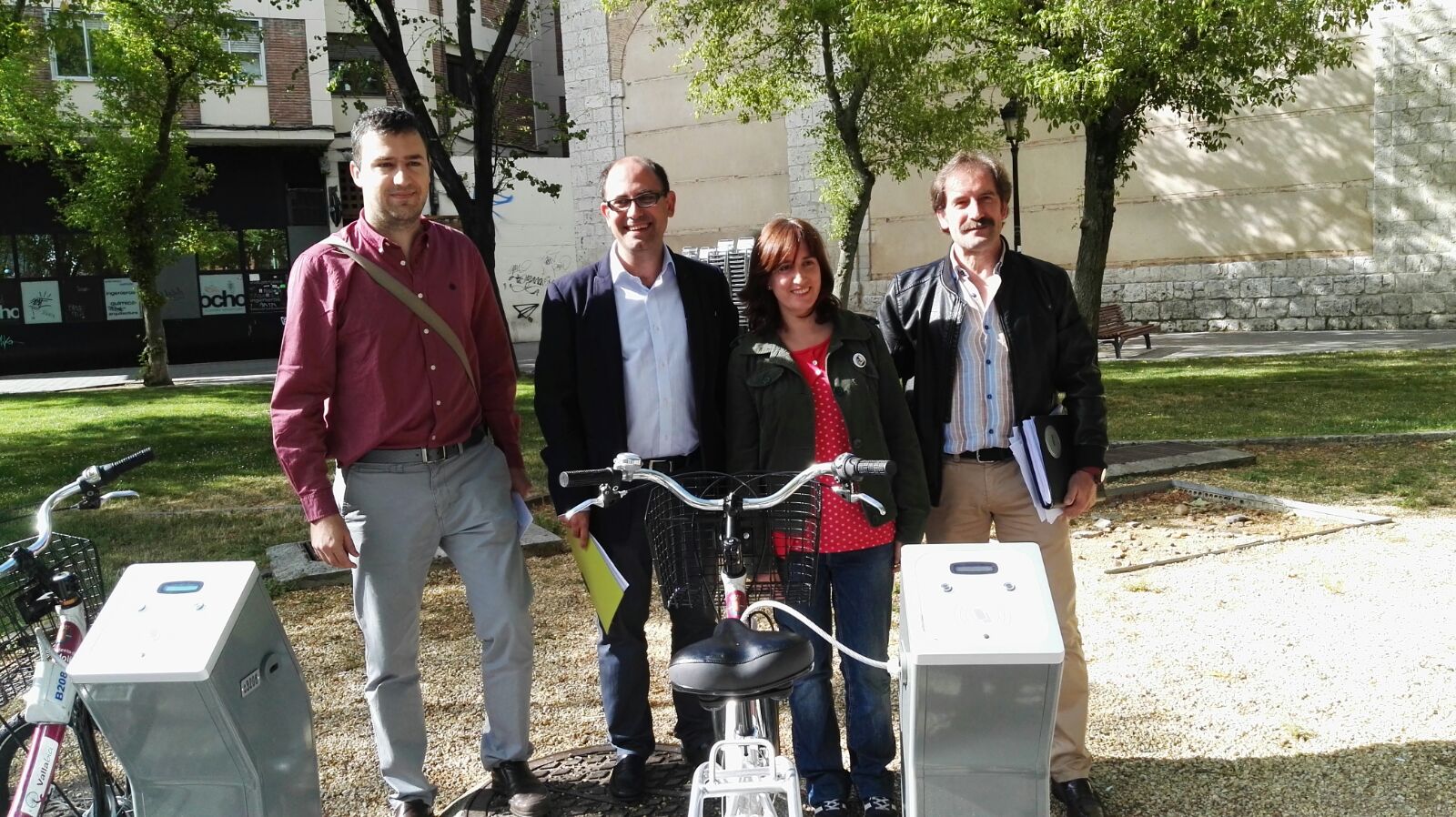 Los concejales de Seguridad y Movilidad Luis Vélez, y de Medio Ambiente y Sostenibilidad María Sánchez, junto con Ramón Sánchez, director técnico de Ingenia Soluciones (concesionario del servicio) y el jefe del Centro de Movilidad, Roberto Riol, han presentado en la mañana de hoy las 3 nuevas estaciones del servicio municipal de alquiler de bicicletas Vallabici.