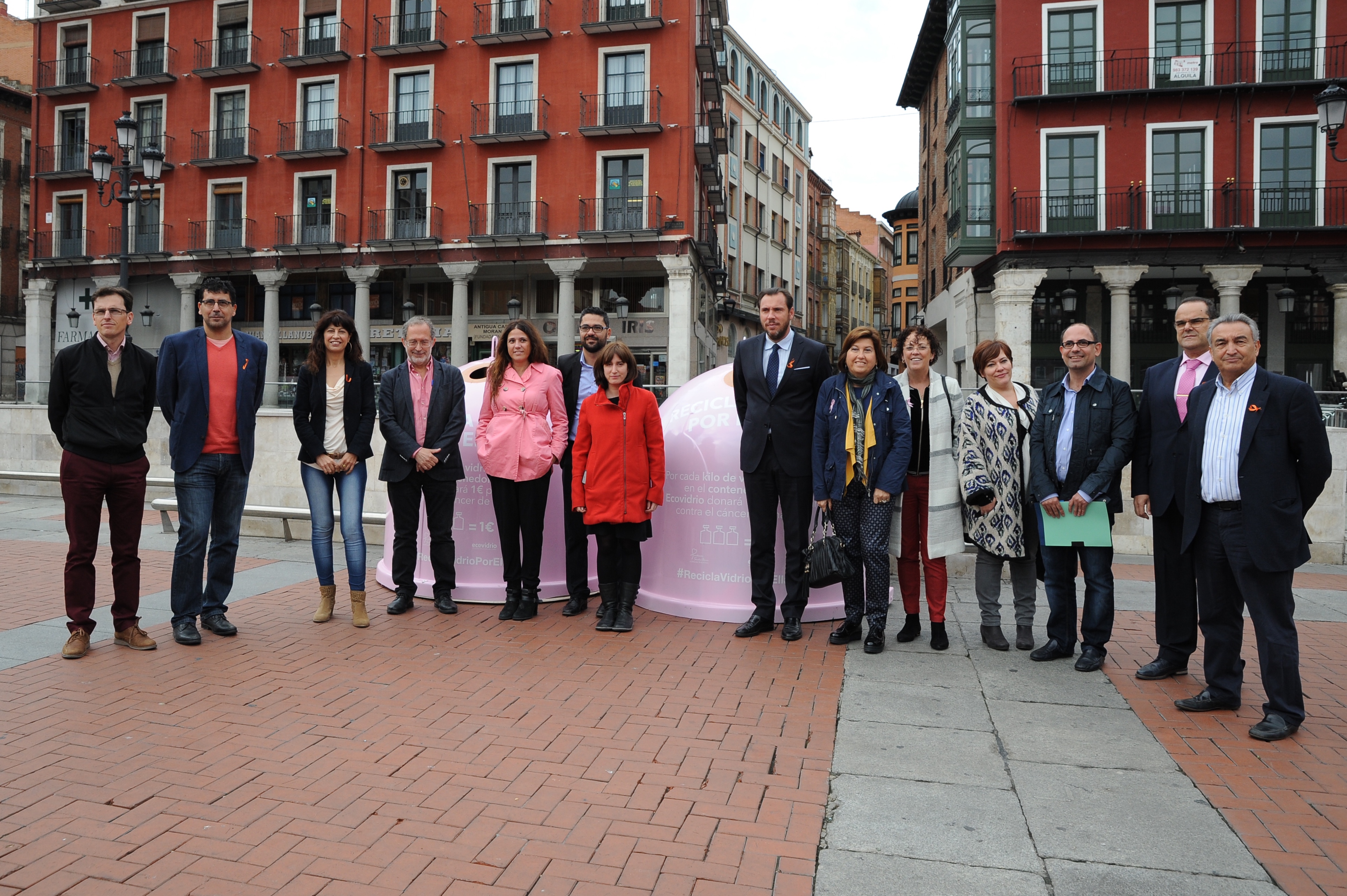 El alcalde de Valladolid, Oscar Puente, acompañado del equipo de Gobierno y otros miembros de la Corporación Municipal, escenificó este jueves su respaldo a la campaña "Recicla Vidrio por ellas", de Ecovidrio, con motivo del Día Mundial del Cáncer de Mama.