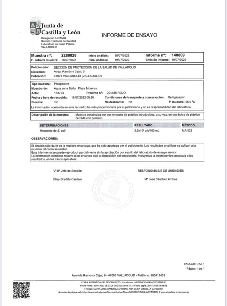 Hoy, el Servicio Territorial de Sanidad de la Junta de Castilla y León ha remitido al Ayuntamiento un nuevo informe en el que se indica que el agua de la Playa de las Moreras vuelve a ser apta para el baño.
