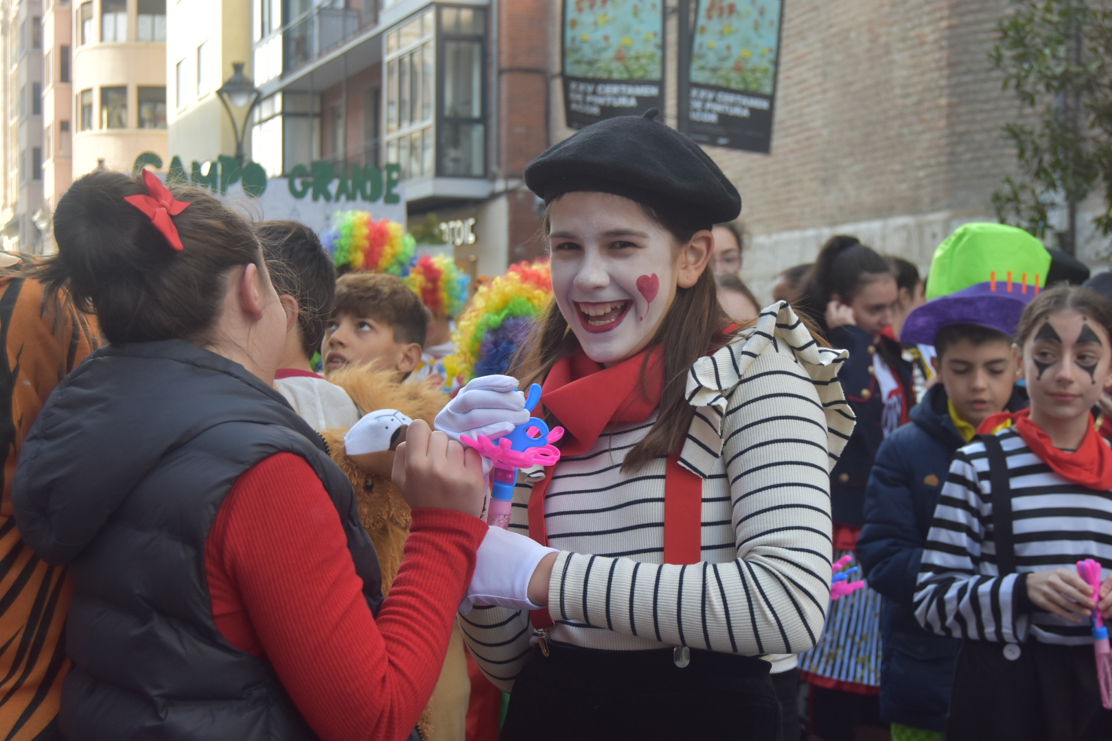 Los escolares han recorrido el Paseo Central del Campo Grande y la calle Santiago hasta la Plaza Mayor, acompañados por la banda de la Escuela Municipal de Música y dos zancudos, que han amenizado el desfile.
