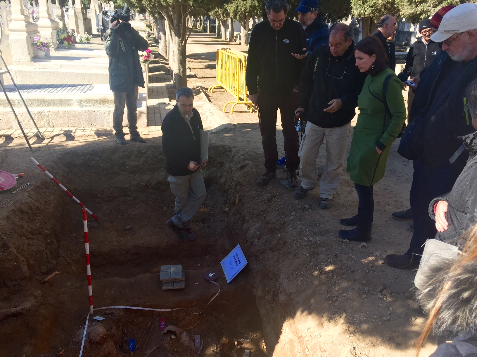 La Asociación para la Recuperación de la Memoria Histórica ha localizado al menos diez cuerpos en la fosa excavada en el Cementerio del Carmen desde el pasado viernes y cuyos trabajos visitó este domingo la concejala de Medio Ambiente y Sostenibilidad, María Sánchez, responsable de la gestión de los cementerios.