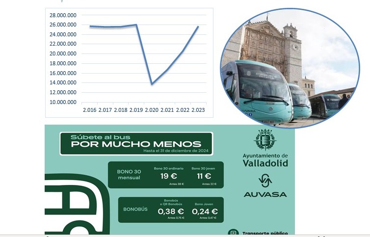 Durante el año pasado los bonos multiviajes tuvieron un descuento del 50%, por una aportación del 30% del Estado, por importe de 3,7 Mill.€, y otra del 20% del Ayuntamiento de Valladolid, por importe de 2,5 Mill.€. En consecuencia, el 86,3% de los viajeros sólo pagaron la mitad del precio de sus desplazamientos. AUVASA cuenta con una flota de 153 autobuses, de los cuales 25 se incorporaron el año pasado, 14 vehículos de GNC y 11 eléctricos.