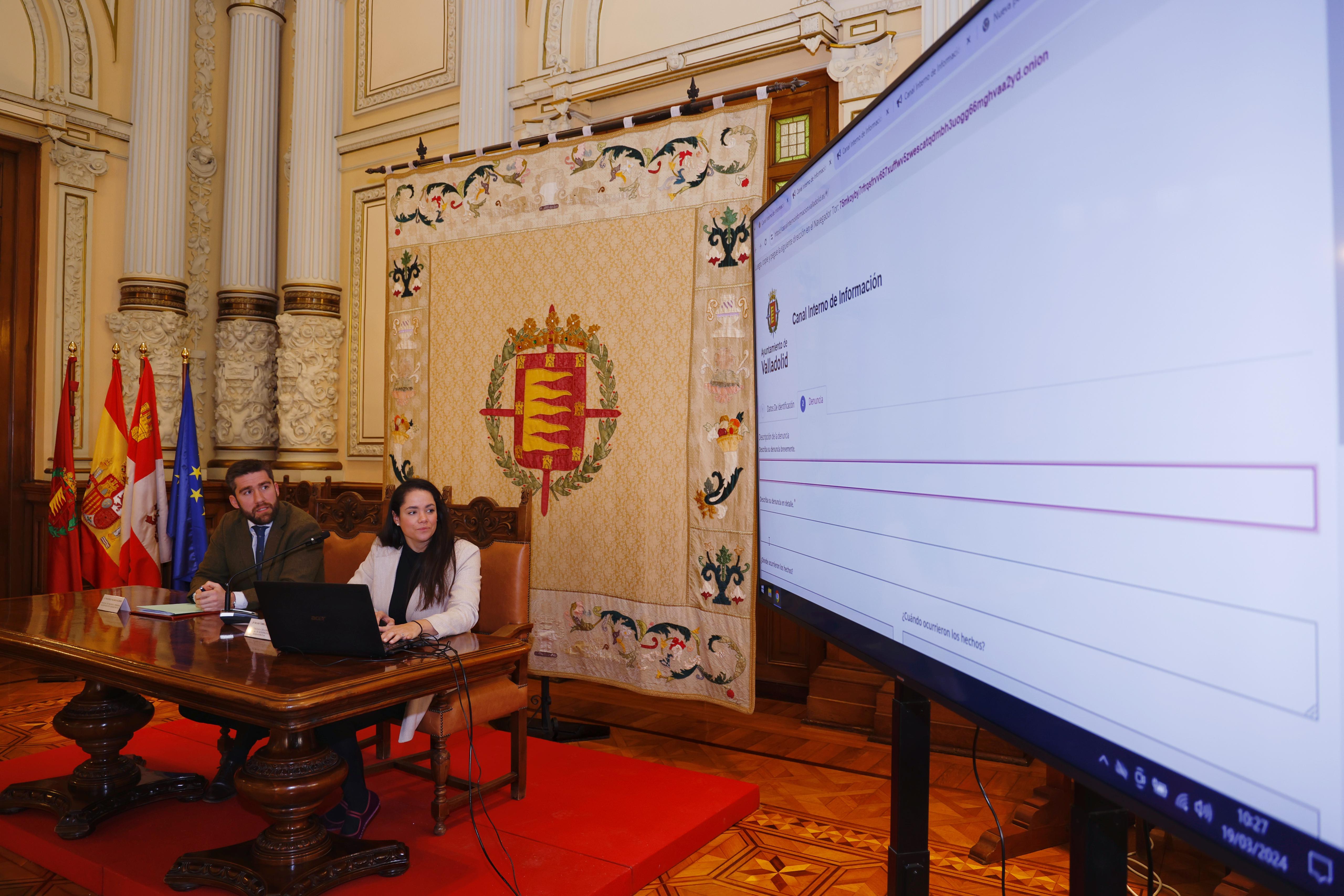 El concejal de Hacienda, Personal y Modernización Administrativa, Francisco Blanco, y la concejala delegada especial de Modernización Administrativa, Silvia Tomillo, han presentado hoy el ‘Sistema Interno de Información’ que el Ayuntamiento de Valladolid ha puesto en marcha al objeto de avanzar con su política de modernización de la Administración y dar cumplimiento a la normativa existente.