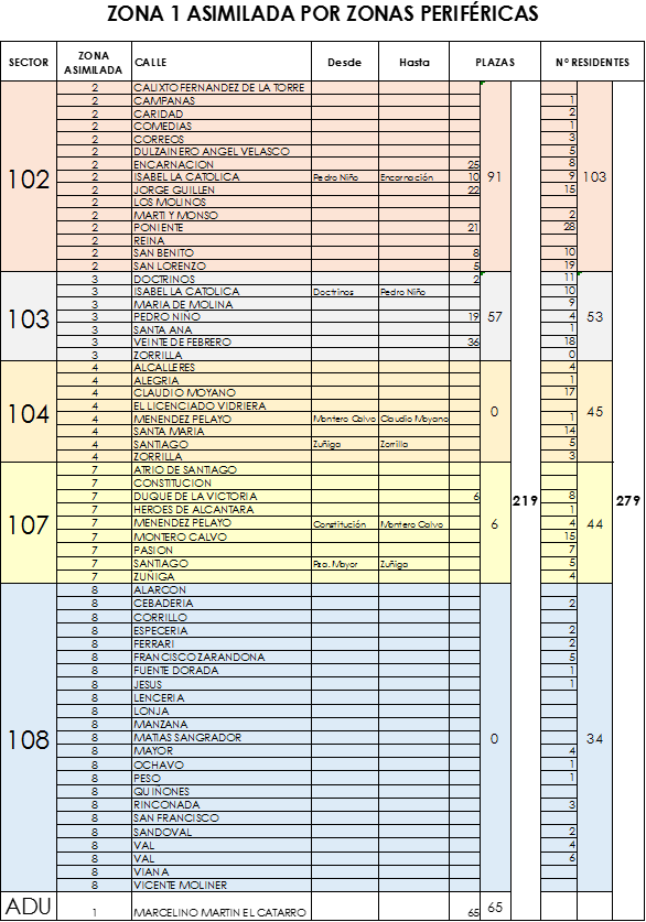 Por lo tanto, se dividirá la zona 1 en 5 Sectores (102, 103, 104, 107 y 108) y cada uno de ellos se asimilará a una zona de las actuales de residentes (2,3, 4, 7 y 8). De este modo, los residentes de cada Sector podrán estacionar en todas las plazas disponibles de la zona 1 y a su vez, en función de su Sector, en la zona de residente a la que se asimile.