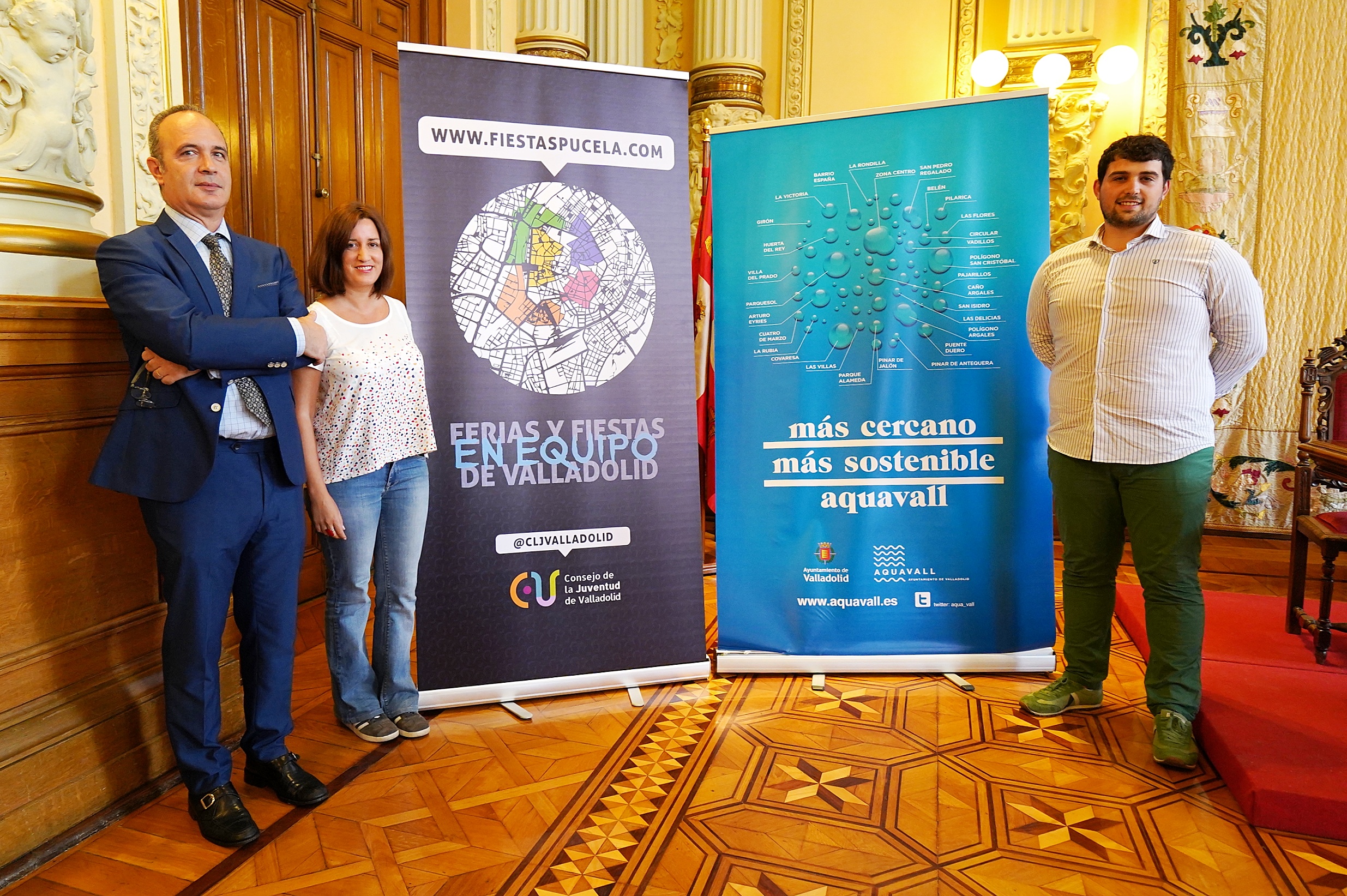 La concejala de Medio Ambiente y Desarrollo Sostenible y presidenta de Aquavall, María Sánchez, el presidente del Consejo Local de la Juventud, Jorge Gómez Villanueva, acompañados por Pedro Arroyo, Gerente de Aquavall, han presentado la campaña ‘Yo elijo agua del grifo’ que se pondrá en marcha durante la Feria y Fiestas de Nuestra Señora de San Lorenzo para concienciar a los jóvenes de las ventajas de consumir agua del grifo y adquirir hábitos de consumo saludables y medioambientalmente sostenibles.