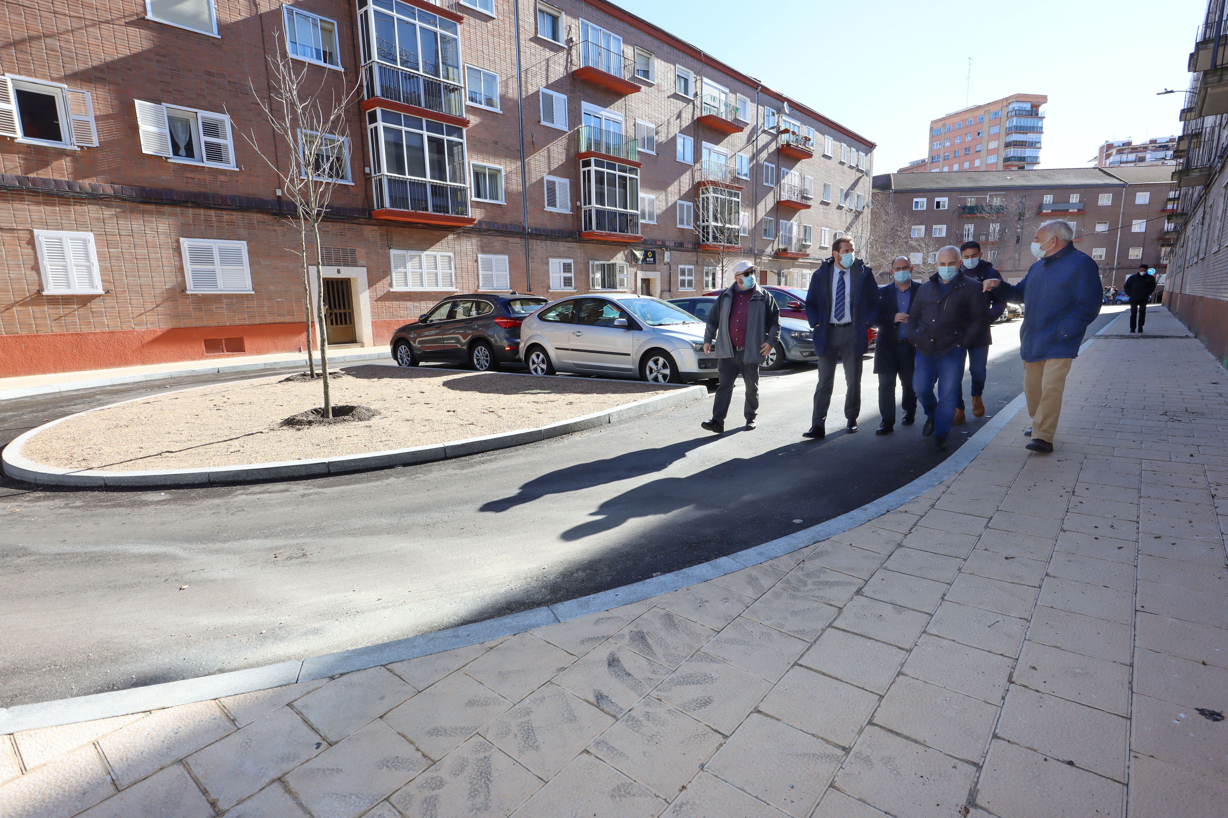 Dicho aparcamiento se concentra en una doble batería central, con circulación perimetral y nuevas aceras pavimentadas con losas de terrazo tipo pétreo de 30 x 30 x 6 centímetros. En los extremos de las baterías se disponen dos pequeñas zonas estanciales en pavimento terrizo con árboles y bancos de madera (estos últimos pendientes de instalar) además de otros cuatro alcorques para árboles de sombra en el eje de la calle. Se deja con pavimento provisional en hormigón la conexión con las aceras de Avda. Reyes Católicos. Previamente se renovó completamente el alcantarillado, dejando también previstas las acometidas para el edificio de viviendas que está rehabilitando la Junta de Castilla y León, y se construyó la nueva red de riego.
