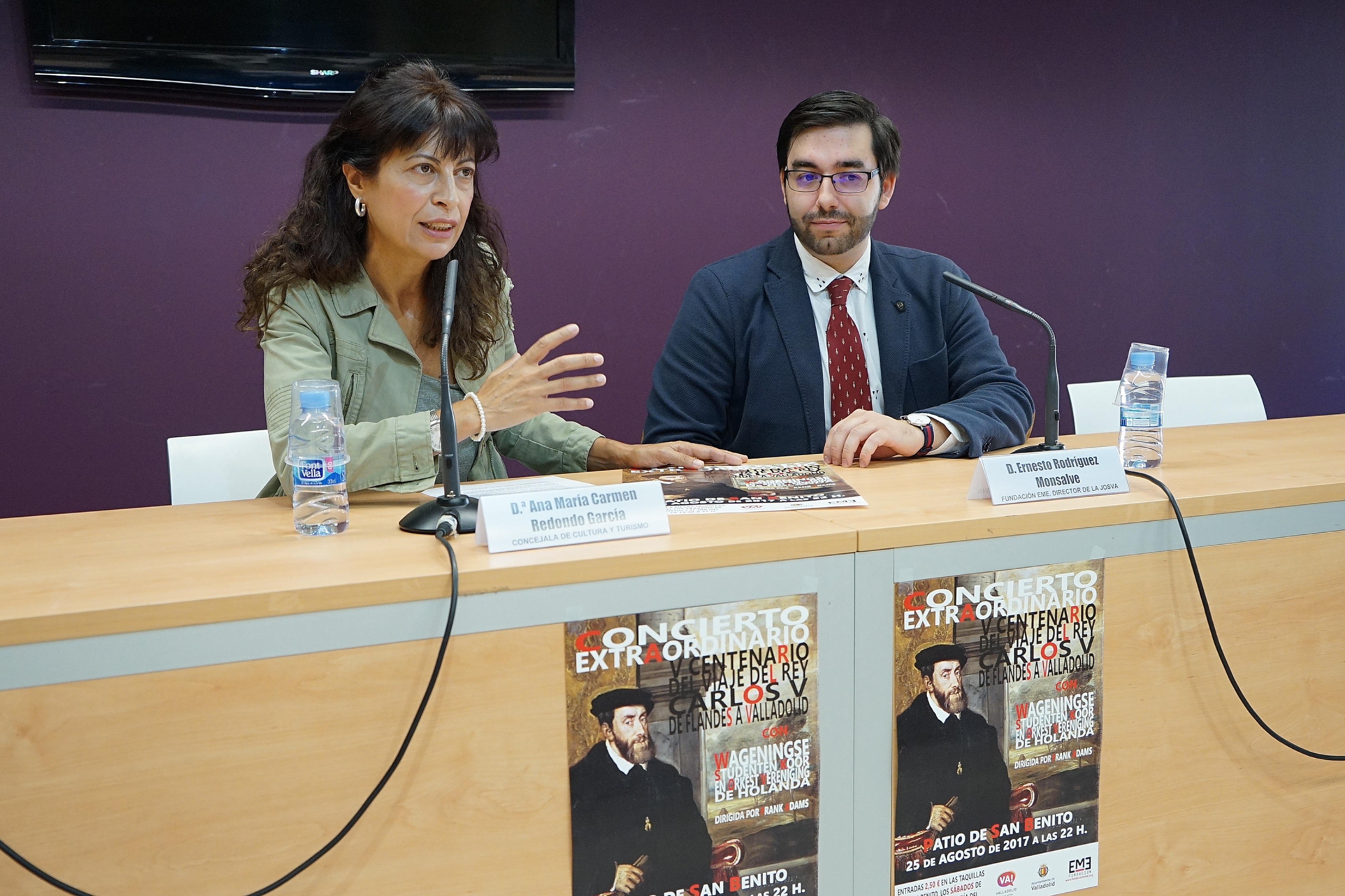 La concejala de Cultura y Turismo, Ana Redondo, y el presidente de la Fundación EME, Ernesto Rodríguez Monsalve, han presentado en la Casa Revilla el concierto que la Joven Orquesta y Coro Sinfónica de Wageningen (Holanda) ofrecerá con motivo de la celebración del V centenario del viaje de carlos V desde Países Bajos a Valladolid.
