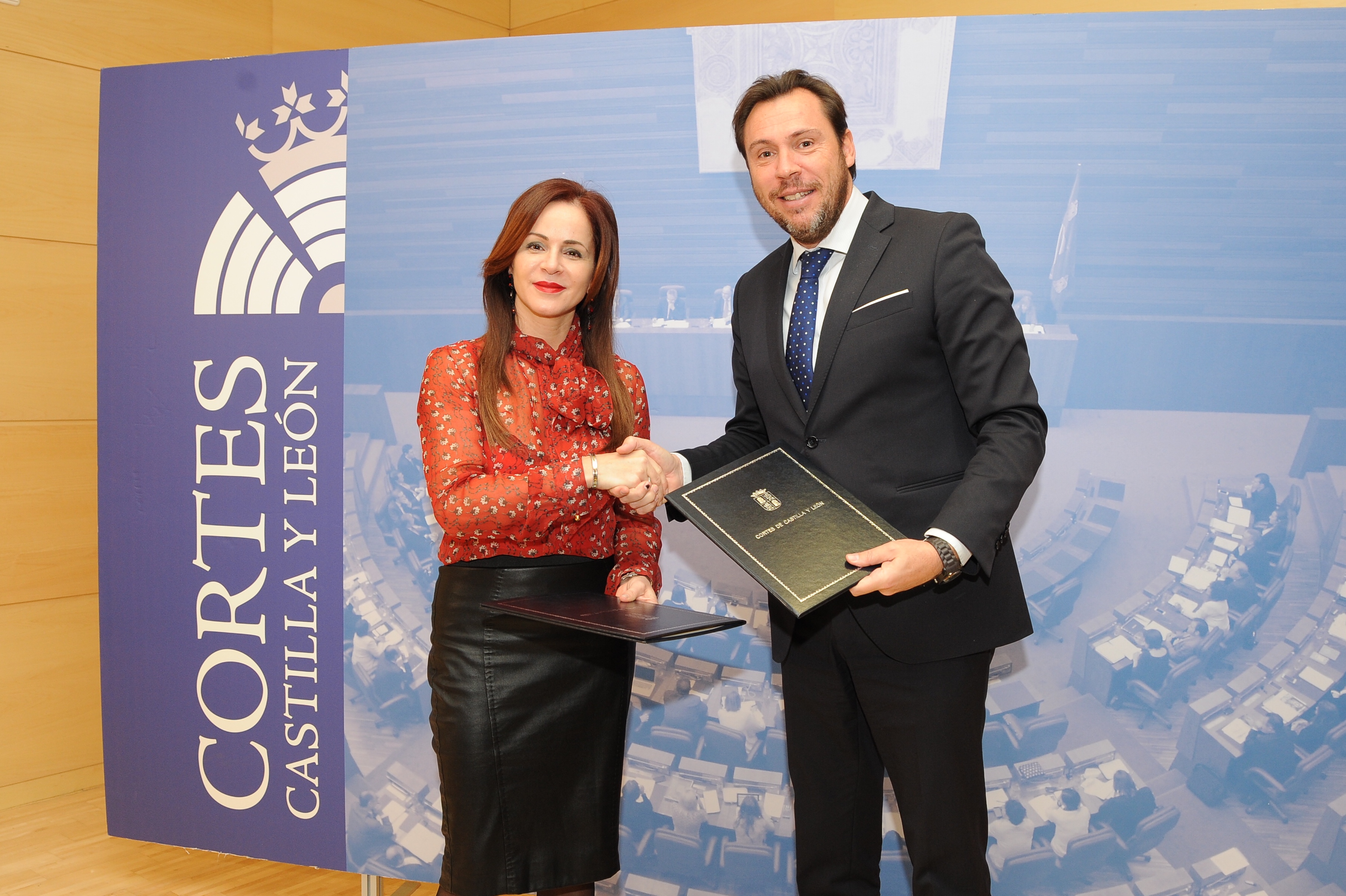 La presidenta de las Cortes de Castilla y León, Silvia Clemente, y el alcalde de Valladolid, Óscar Puente, han suscrito un convenio de colaboración con el objetivo de acercar el Parlamento autonómico a los vallisoletanos y favorecer el conocimiento de esta institución.