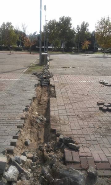 1. Demolición y reposición de pavimentos dañados (levantados por las raíces del arbolado, con cesiones, erosionados por el uso, etc.) y de la red de correderas y canalizaciones superficiales construidas en su día para la evacuación de las aguas pluviales (caz longitudinal, canaletas o sumideros lineales transversales y sumideros tapados con hormigón). Se proyecta adicionalmente una ampliación de la superficie pavimentada con aglomerado entre la zona de aparatos infantiles y la montaña rusa (aunque su ejecución se pospone por razones presupuestarias).