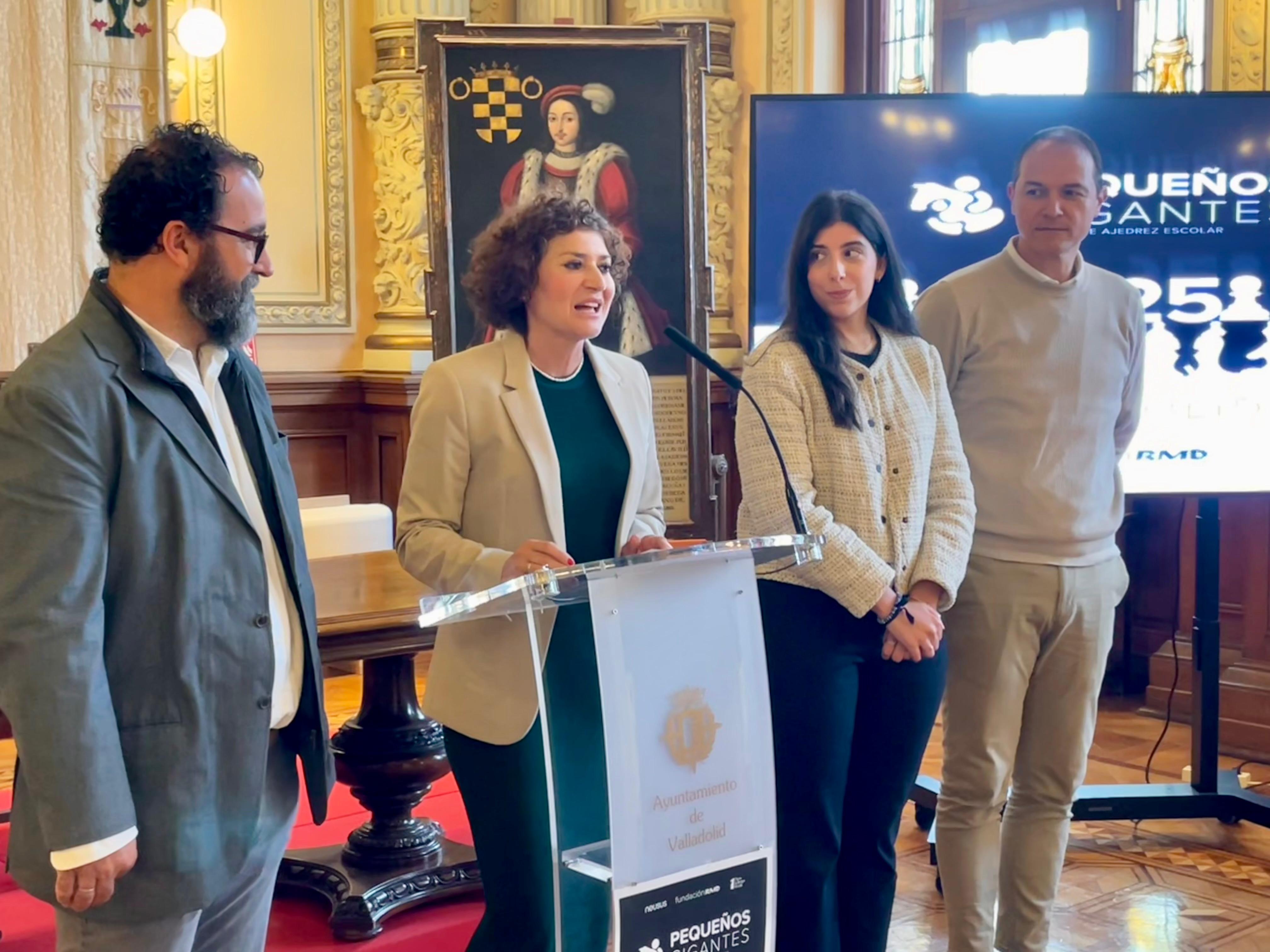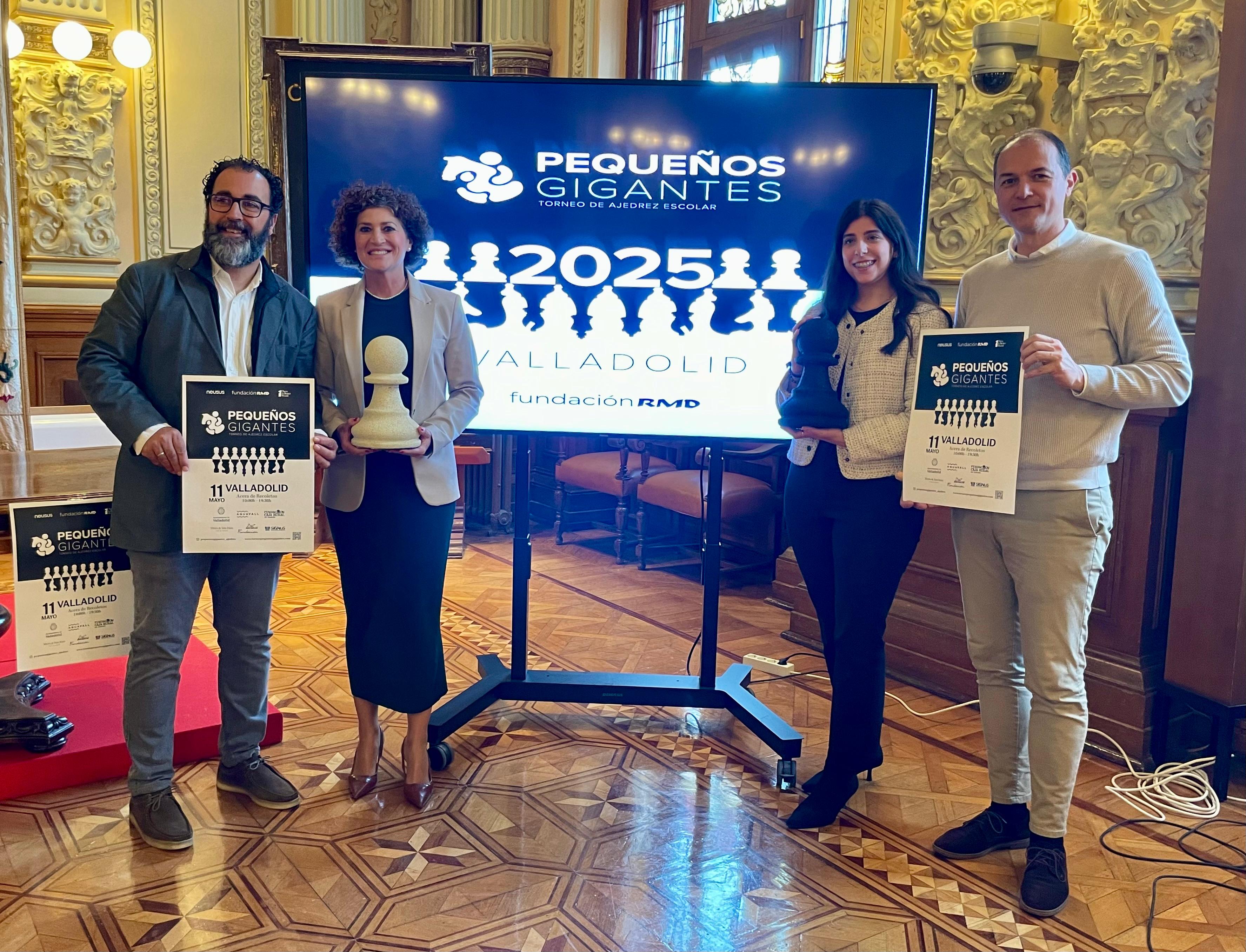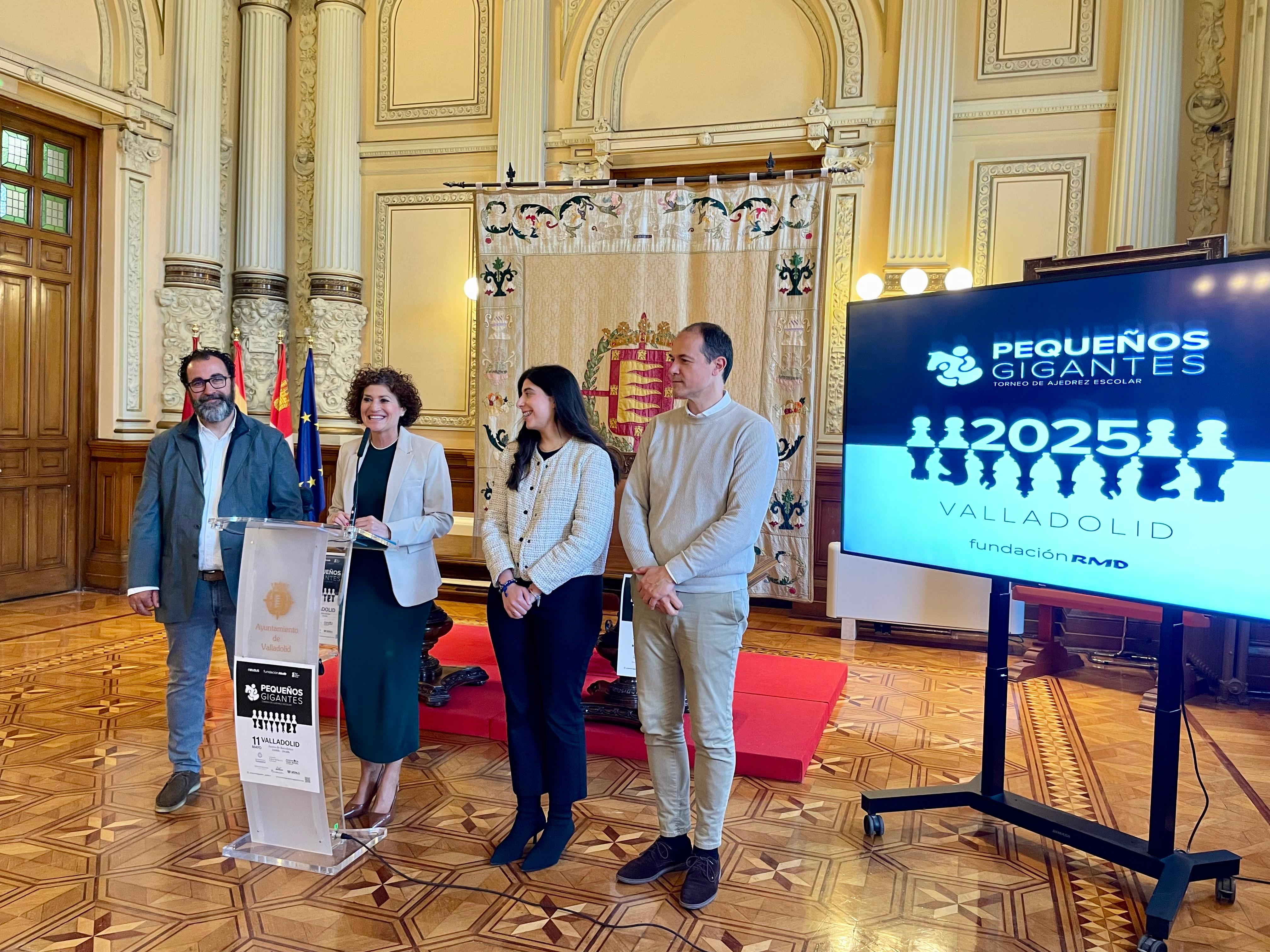 El Ayuntamiento de Valladolid ha acogido en la mañana de hoy la presentación de una nueva edición del Torneo de Ajedrez Escolar ‘Pequeños Gigantes’, que, por segundo año, en el marco del circuito 2025 del evento, recalará en la ciudad de la mano de la Fundación RMD, para celebrarse el próximo domingo, 11 de mayo, en un escenario diferente al del año pasado que tuvo lugar en la Plaza de Portugalete: el entorno de la Acera de Recoletos.