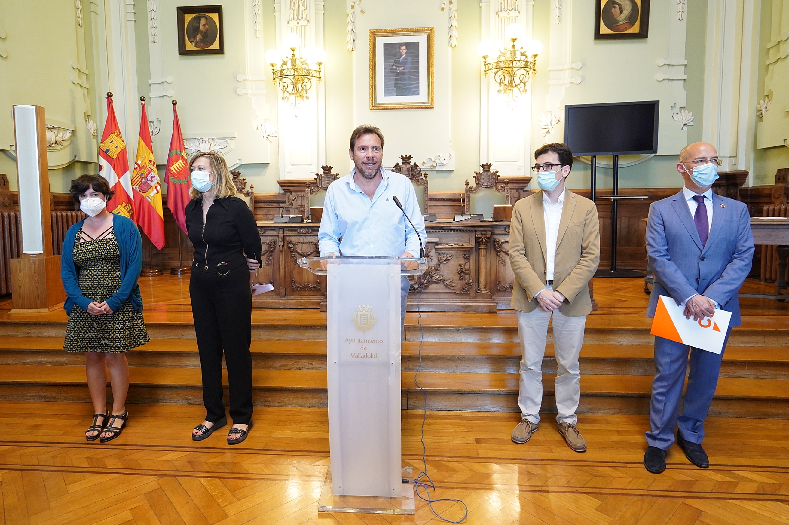 El alcalde, Óscar Puente, y los portavoces de los cuatro grupos municipales que integran el Grupo de Trabajo para la recuperación económica y social de la crisis sanitaria del COVID-19 han presentado la moción conjunta que se aprobará en el pleno del próximo martes 7 de julio. Pedro Herrero (Partido Socialista), Pilar del Olmo (Partido Popular), Martín Fernández Antolín (Ciudadanos) y María Sánchez (Valladolid Toma La Palabra) han desgranado las medidas que se incluyen en ese documento que han firmado tras la comparecencia ante los medios de comunicación.