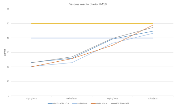 De acuerdo con esta previsión, ya durante el día de ayer, 10 de febrero de 2022, se registraron valores medios diarios superiores a 40 µg/m3 para el material particulado PM10, en todas las estaciones de la RCCAVA. En el "Plan de Acción en situaciones de alerta por contaminación del aire urbano en Valladolid", el valor previsto para la activación de la "situación 1, preventiva" es 40 µg/m3 para el PM10 como valor medio diario en más de una estación de medición. Estos valores no deben de estar afectados por condiciones locales naturales, por lo que no se activará el Plan de Acción.