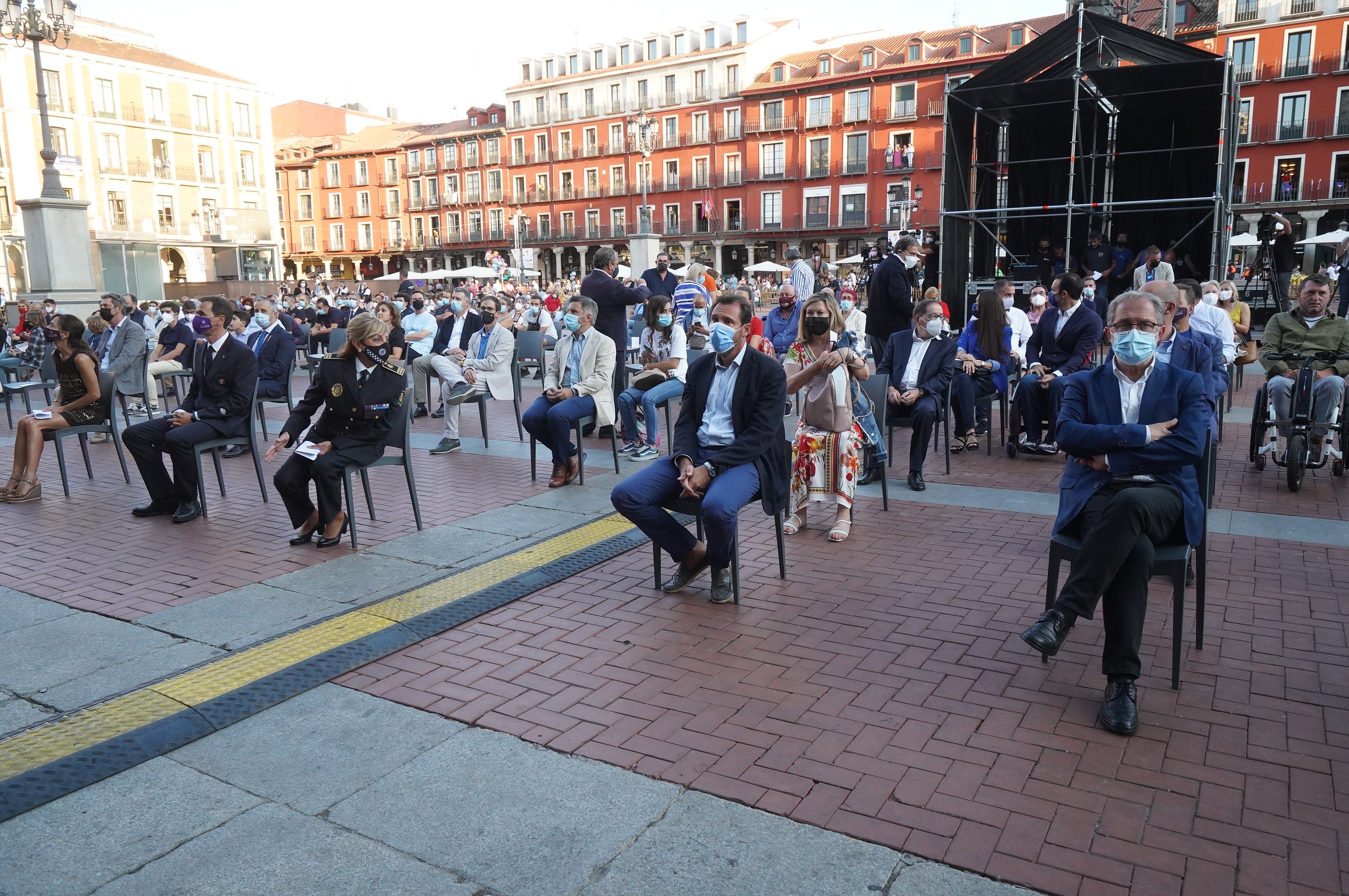 Con el aforo limitado por las medidas de seguridad, miembros de la Corporación Municipal, autoridades de distintas administraciones y representantes de la sociedad vallisoletana asistieron al acto de la Plaza Mayor con la esperanza de que el próximo año sea el de la normalidad absoluta.