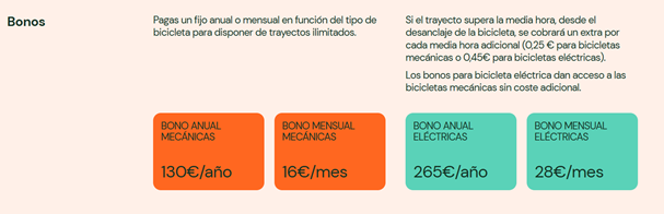 En el caso de los bonos para trayectos ilimitados, los precios oscilan entre los 16 euros mensuales y 130 euros anuales para bicicletas mecánicas y los 28 euros mensuales y los 256 euros anuales para bicicletas eléctricas.