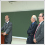 El secretario general de la Universidad, Luis Santos Domínguez; el alcalde, Francisco Javier León de la Riva, y el director de la Facultad, José Antonio Salvador Insúa, han asistido a esta segunda jornada de los actos conmemorativos de la fundación del centro, conocido como Escuela Elemental de Comercio de Valladolid, en el Aula 12, de la primera planta, en donde se procedido al cambio de nombre de la misma por el de Aula "Ayuntamiento de Valladolid".