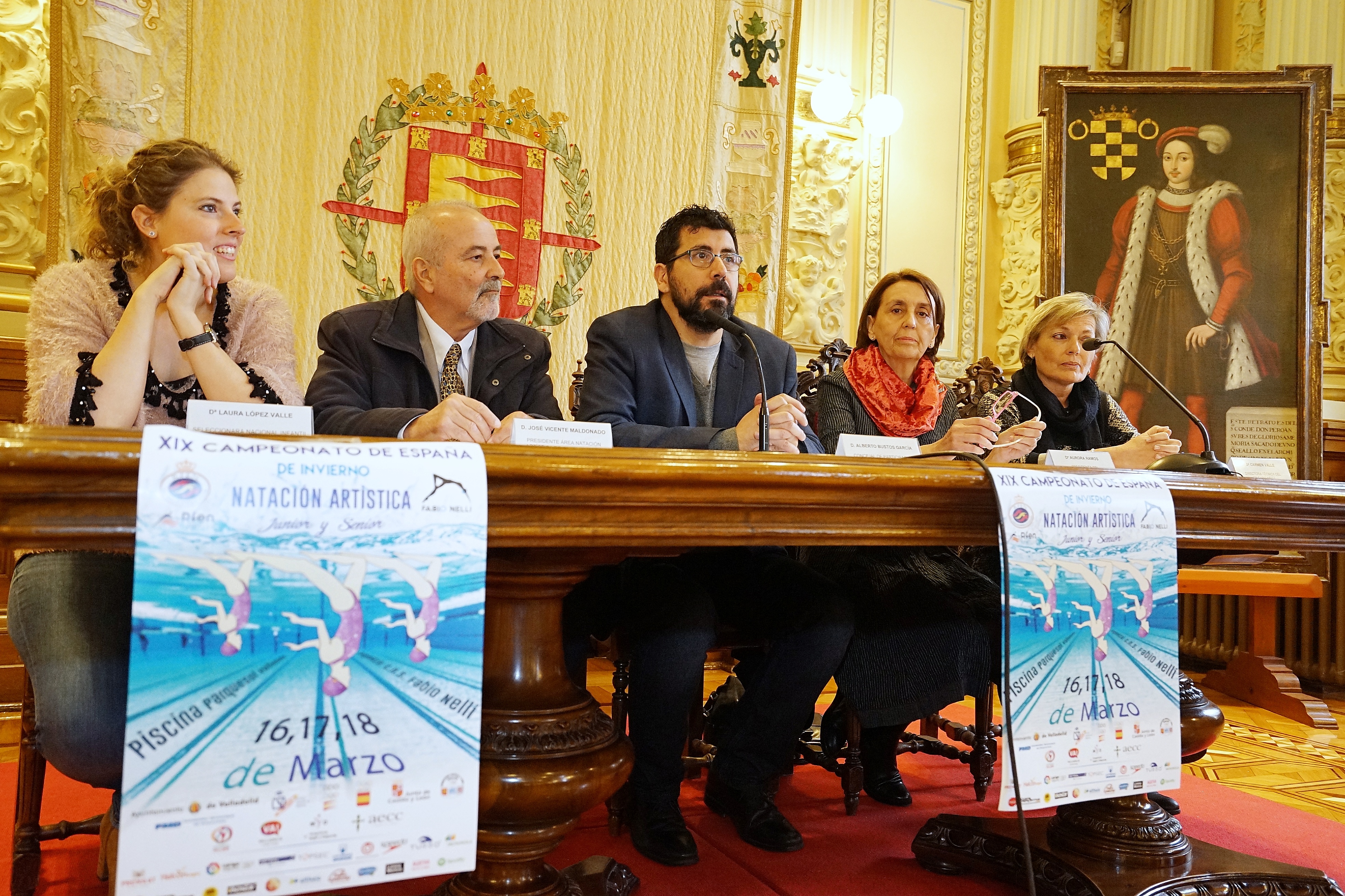 El concejal de Deportes, Alberto Bustos, acompañado de la presidenta del Club de Natación Fabio Nelli, Aurora Ramos, el presidente de la Federación de Natación de Castilla y León, Antonio García, y Carmen Valle como directora técnica del club organizador, presentó...- Fecha de la noticia