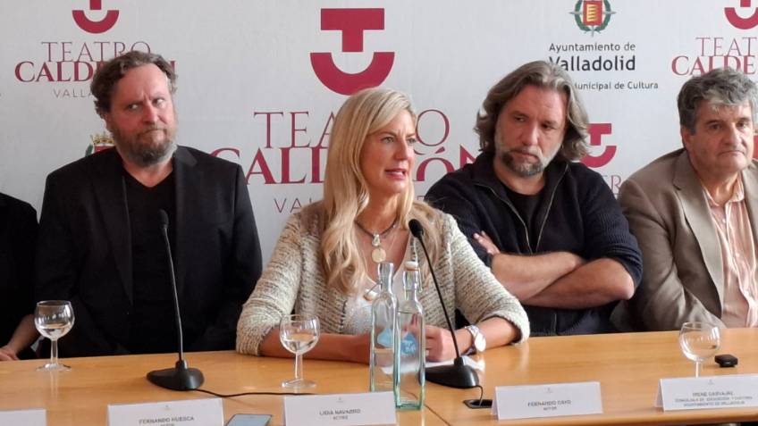 La concejala de Educación y Cultura del Ayuntamiento de Valladolid, Irene Carvajal; el director del Teatro Calderón, José Mª Viteri; el director de escena Javier Hernández-Simón; el autor teatral Ignacio Del Moral. y el elenco de actores, Yune Nogueiras, Marcial...