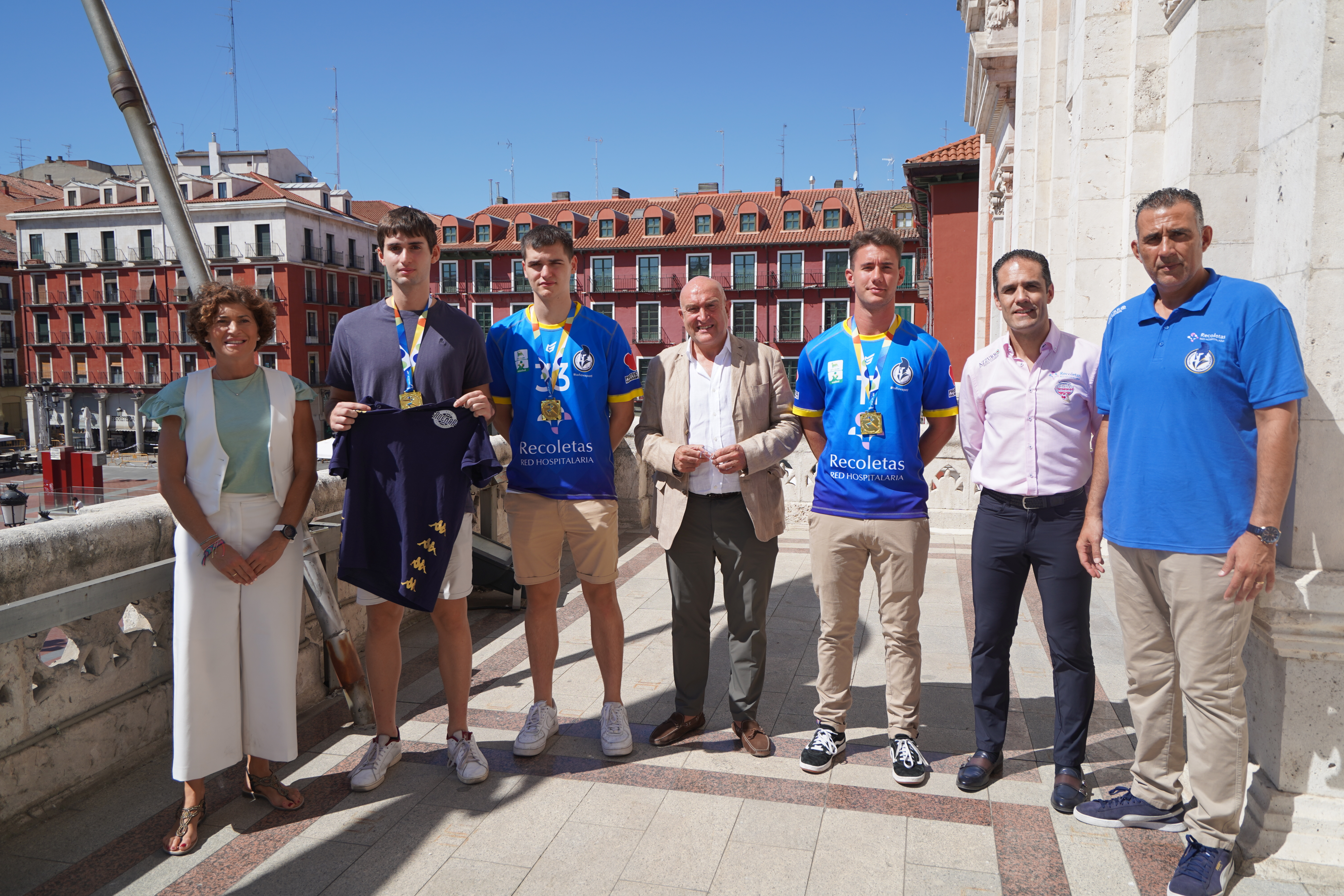 El alcalde de Valladolid, Jesús Julio Carnero, ha felicitado hoy personalmente a los tres vallisoletanos que se han proclamado Campeones del Mundo con la selección española juvenil de balonmano que ha participado en el Mundial celebrado recientemente en Croacia, en un acto que ha tenido lugar en el Salón de Recepciones del Ayuntamiento. Se trata de los jugadores del CD Balonmano Recoletas Atlético Valladolid Alejandro Pisonero y Pablo Herrero, ambos de 19 años, y de Álvaro Pérez, jugador del Club de Balonmano ABANCA Ademar de León, que cuenta con 18 años de edad.