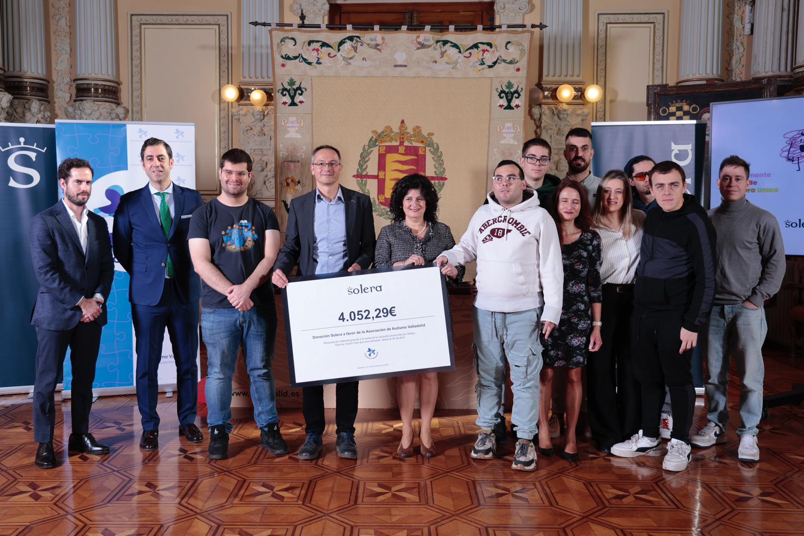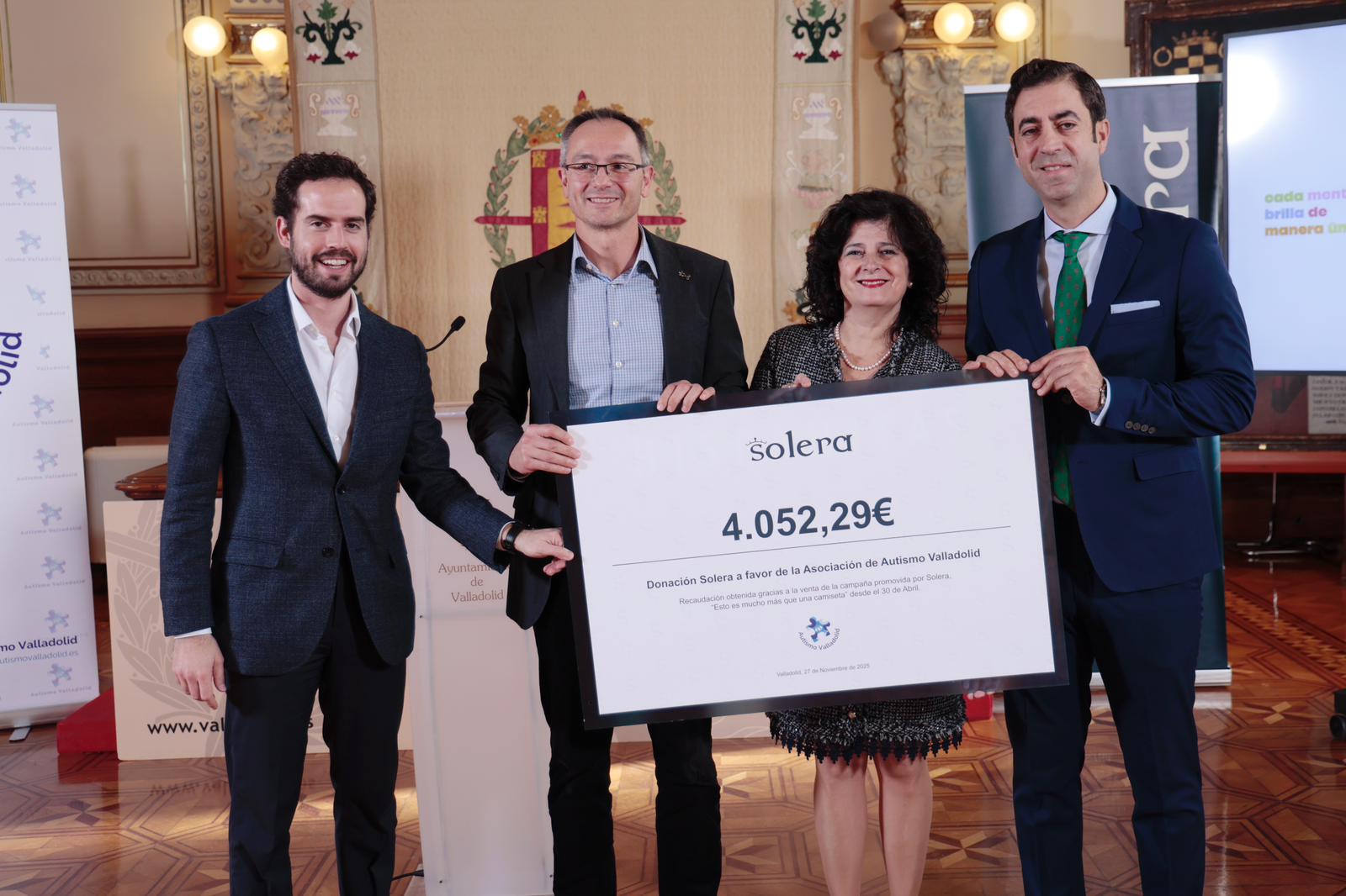 El concejal de Comercio, Mercados y Consumo, Víctor Martín, y el CEO de Solera, Jaime Curiel, han hecho entrega a la presidenta de la Asociación de Autismo de Valladolid, Concepción Galván, de los 4.052 euros recaudados en el marco de la campaña solidaria ‘Esto es mucho más que una camiseta’ en favor del autismo; una iniciativa puesta en marcha el pasado mes de abril, con motivo del Día Mundial de Concienciación sobre el Autismo.