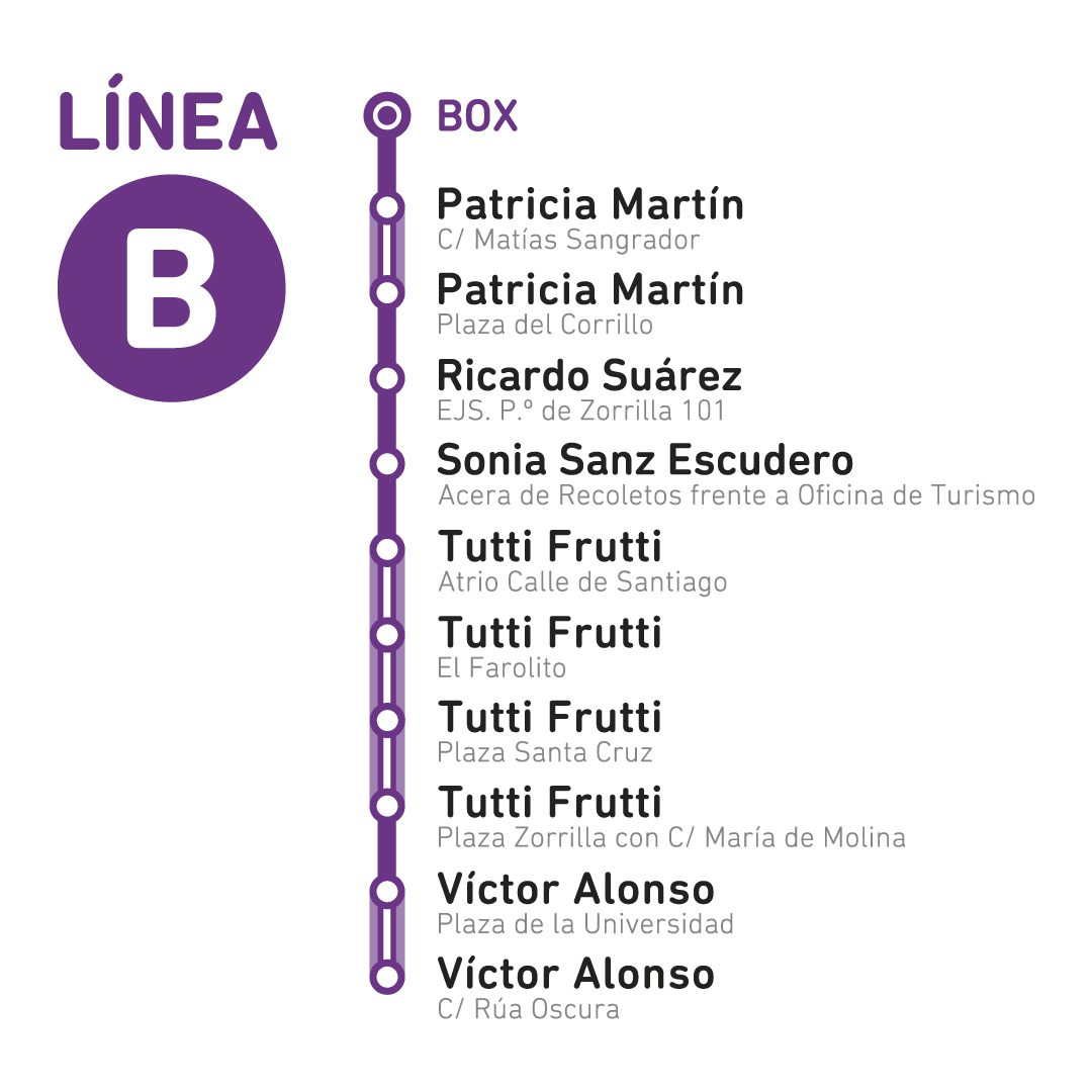 Museo Patio Herreriano de Arte Contemporáneo Español de Valladolid | Aparcamientos españoles SA| AUVASA | Banco Santander | Centro de alumbrado público. Concejalía de Urbanismo, Infraestructuras y Vivienda. Servicio de Ocupación de Vía Pública I Concejalía de movilidad y espacio urbano | Carlos de Miguel - Espacio Joven Sur | Leticia Martínez - Escuela Superior de Diseño ESI | Elisa García Ferreiro - Super-López Gómez 22 Comunidad SLU y Luz Saura - Saura Olmedo Fincas Legal - Comunidad del garaje de calle de los Moros 4 | Pepe - Droguería y Perfumería Pompeya | Edu Omega | Mario Tovar - La Romana Pizzería | Miguel Ortega y Cristina Jubitero Fernández - Fincaolid - Comunidad de vecinos de Tirso de Molina 35 | Luis Ángel Rodríguez Barrigón - Asesoría y Admón. de Fincas Rodsanz - Comunidad de vecinos de Amor de Dios 29 | Skow | Marc Mascort - Montana Colors | Pinturas Jesús Delgado y en especial a Jorge Peligro.