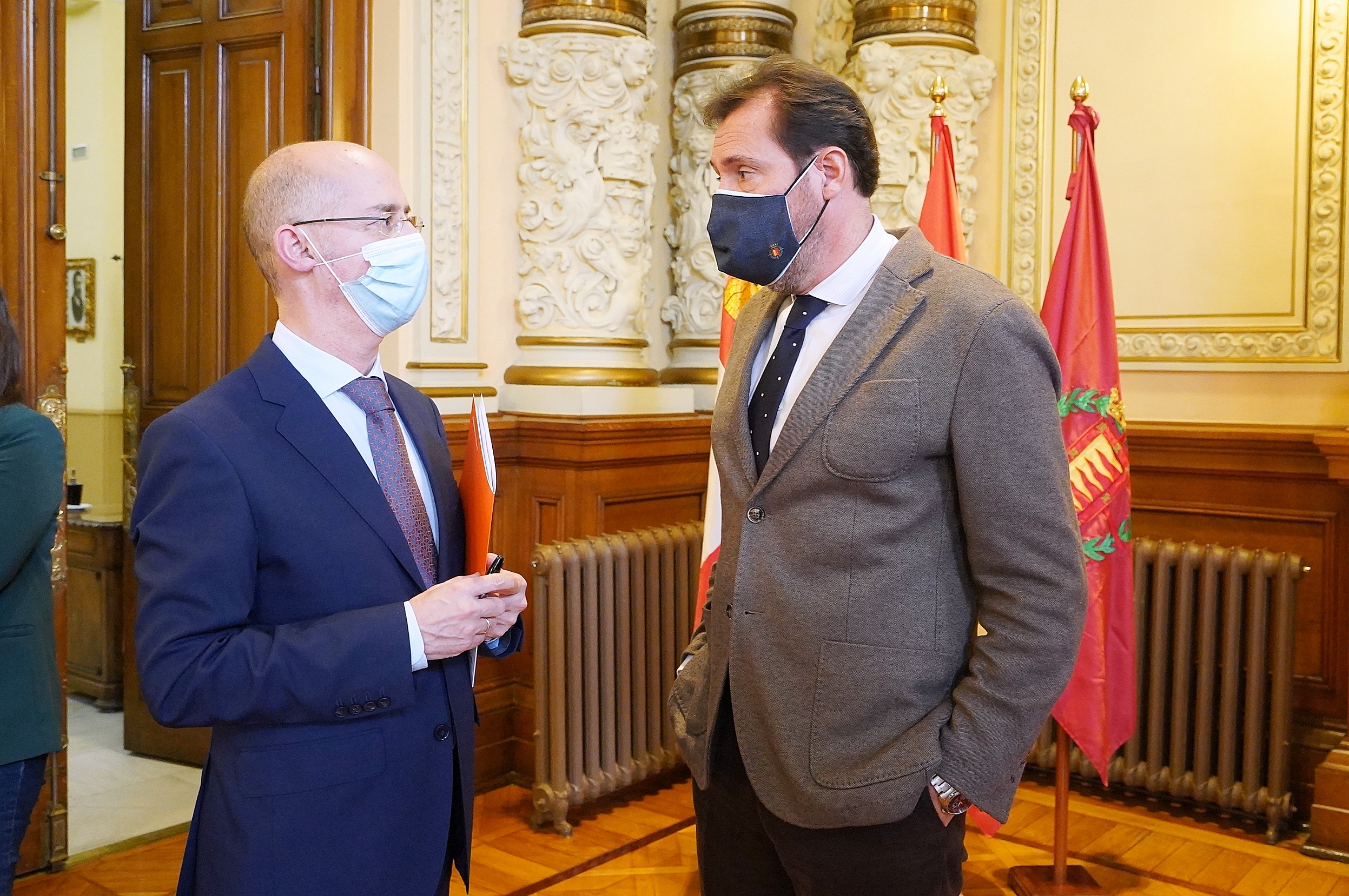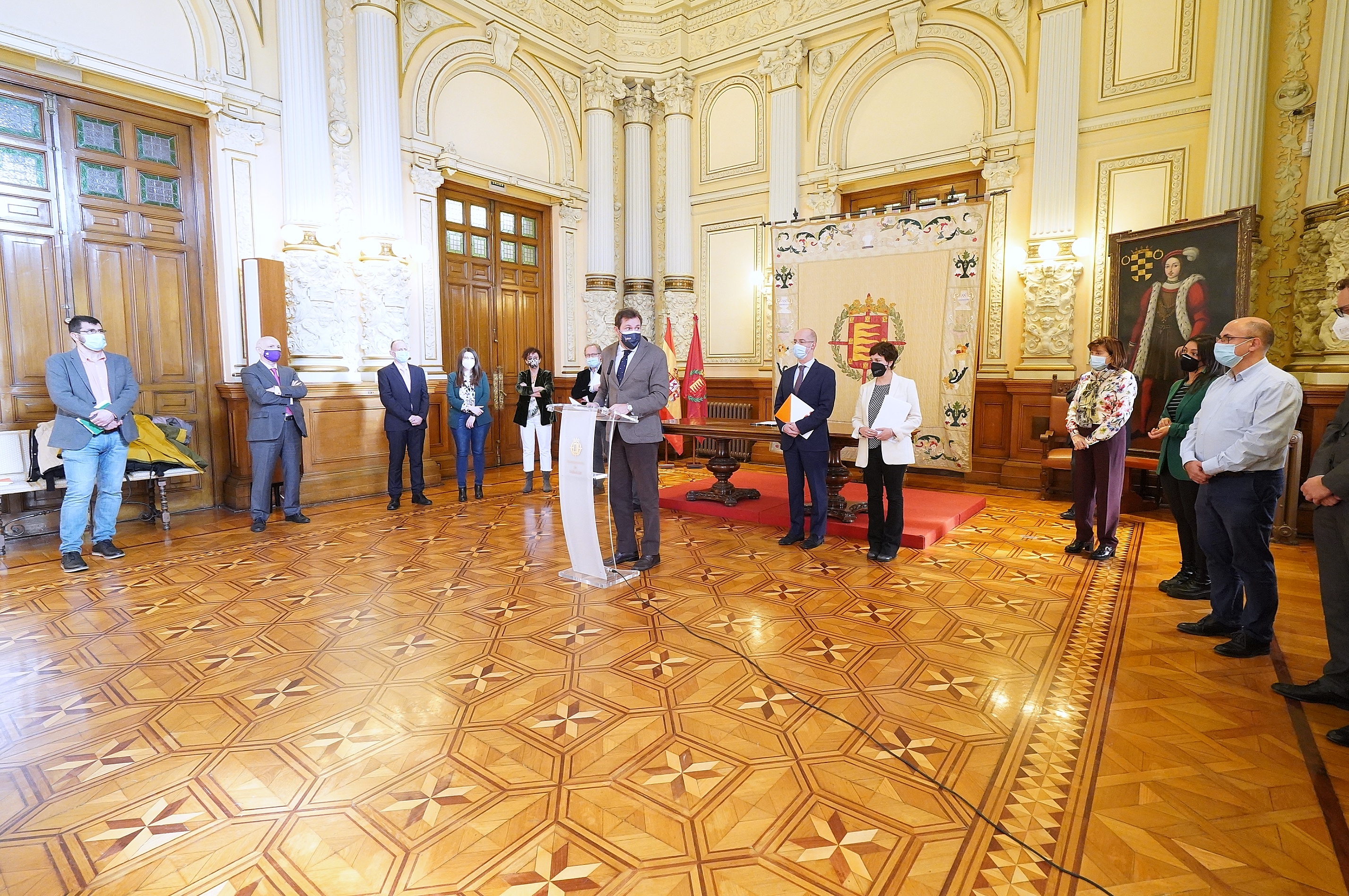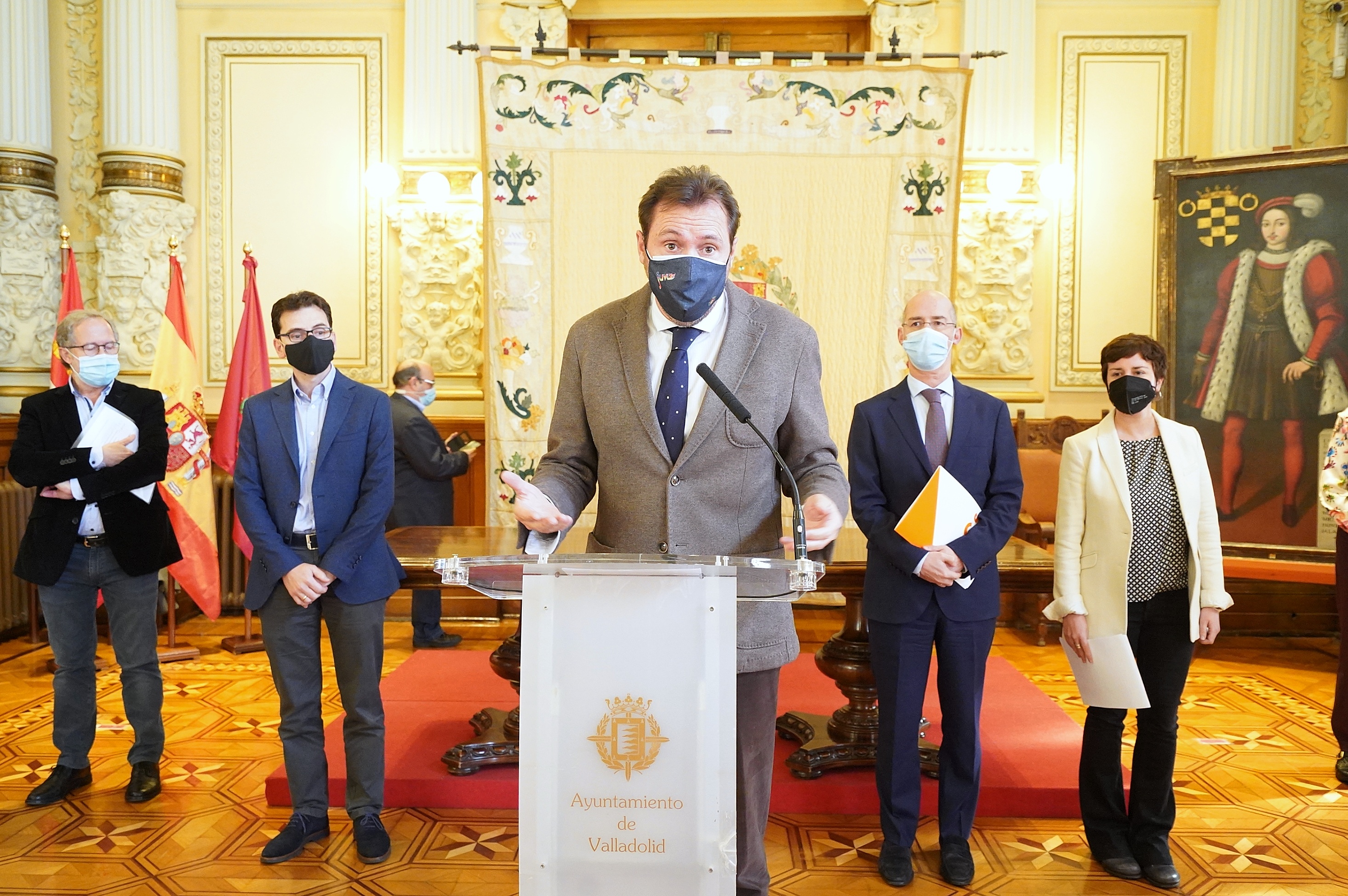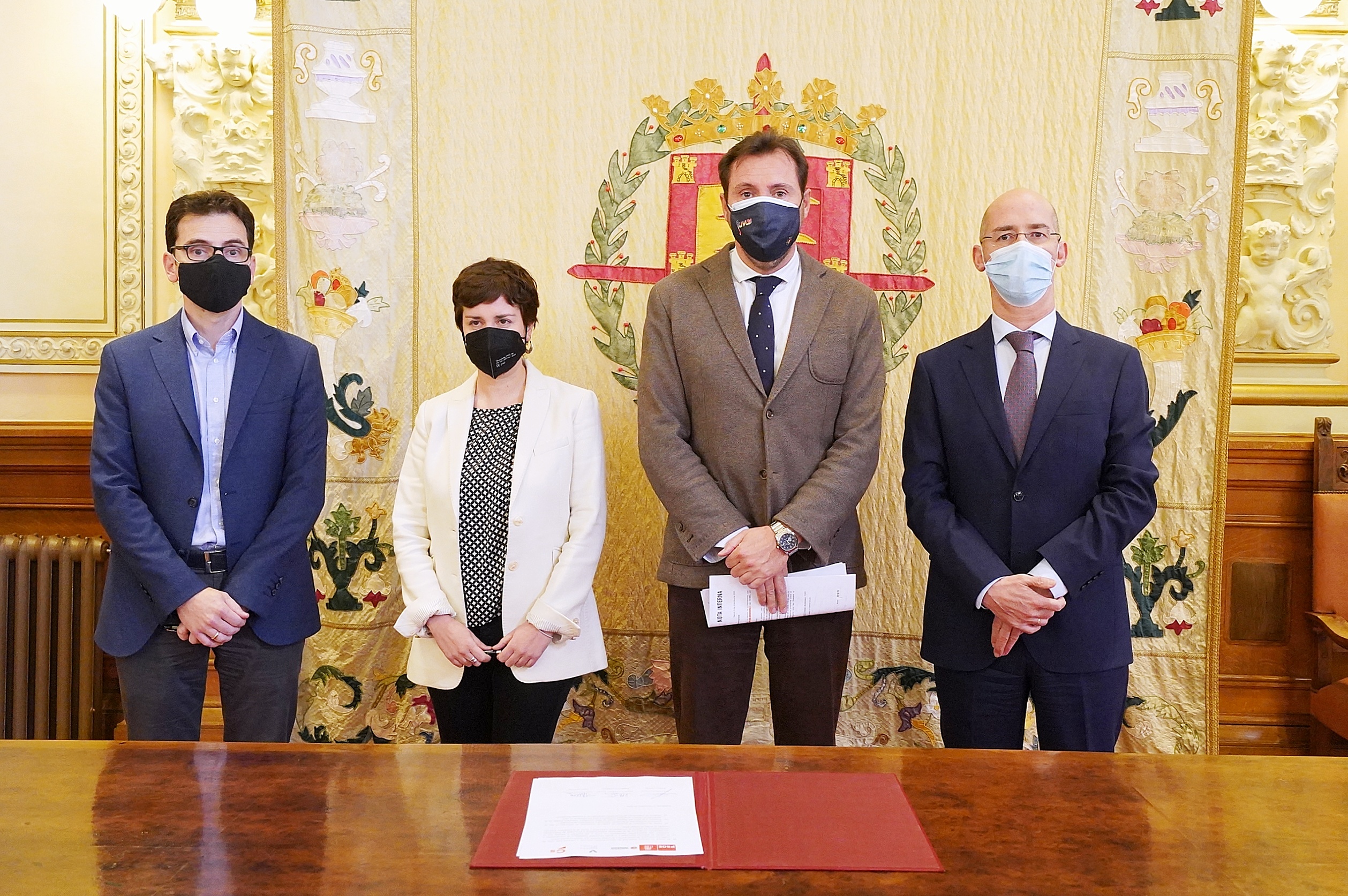 El Equipo de Gobierno, que integran PSOE y Valladolid Toma la Palabra, y el Grupo Municipal Ciudadanos, "primando el interés de la ciudadanía de Valladolid y superando sus diferencias programáticas", han alcanzado un acuerdo en torno al excepcional ejercicio presupuestario 2021. El pacto ha sido presentado en el Salón de Recepciones del Ayuntamiento de Valladolid con la presencia del alcalde, Óscar Puente, y los portavoces del Grupo Municipal Socialista (Pedro Herrero), Cs (Martín Fernández Antolín) y VTLP (María Sánchez). AYT06666-01AYT06666-01