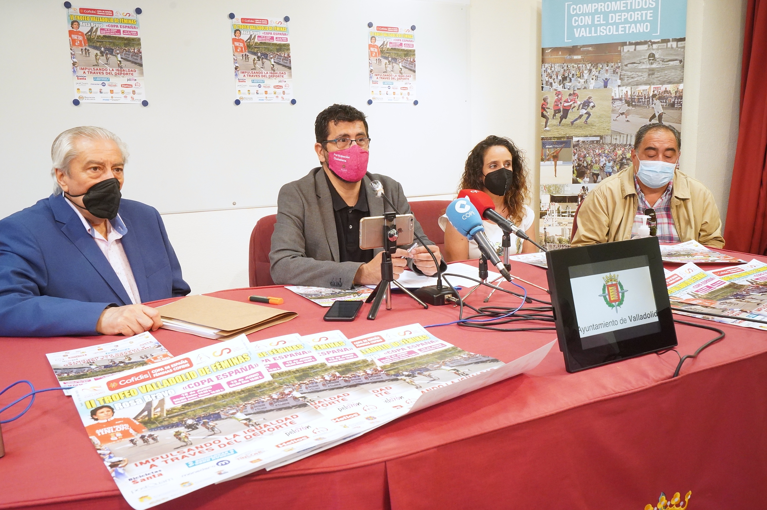 El concejal de Participación Ciudadana y Deportes, Alberto Bustos, ha presentado hoy en la Casa del Deporte el II Trofeo Féminas de Valladolid Rosa Bravo – Copa de España acompañado por Jesús Nieto, representado al Club Deportivo Pucela, el presidente de la Federación de Ciclismo de Castilla y León, Mariano Palacios, y la ciclista Rosa Bravo.