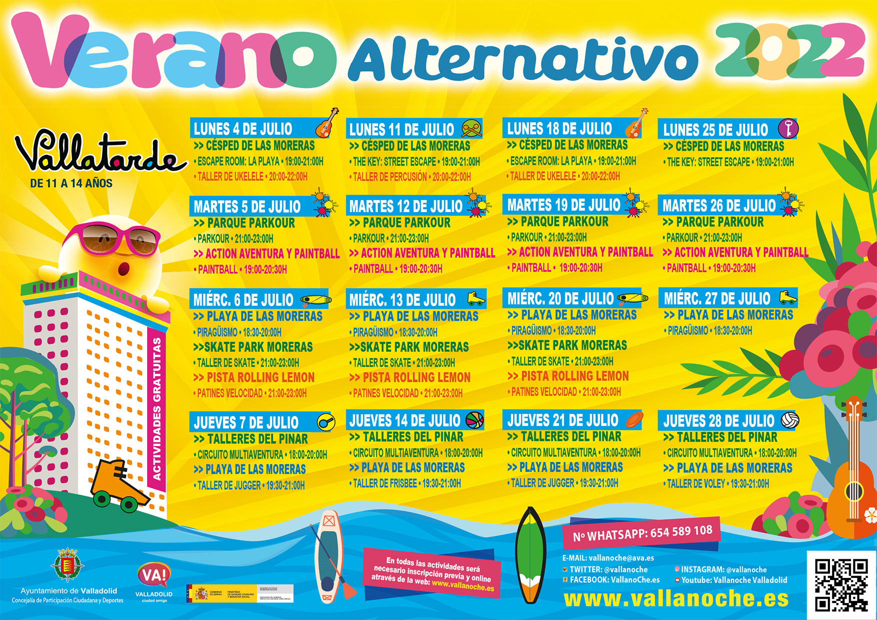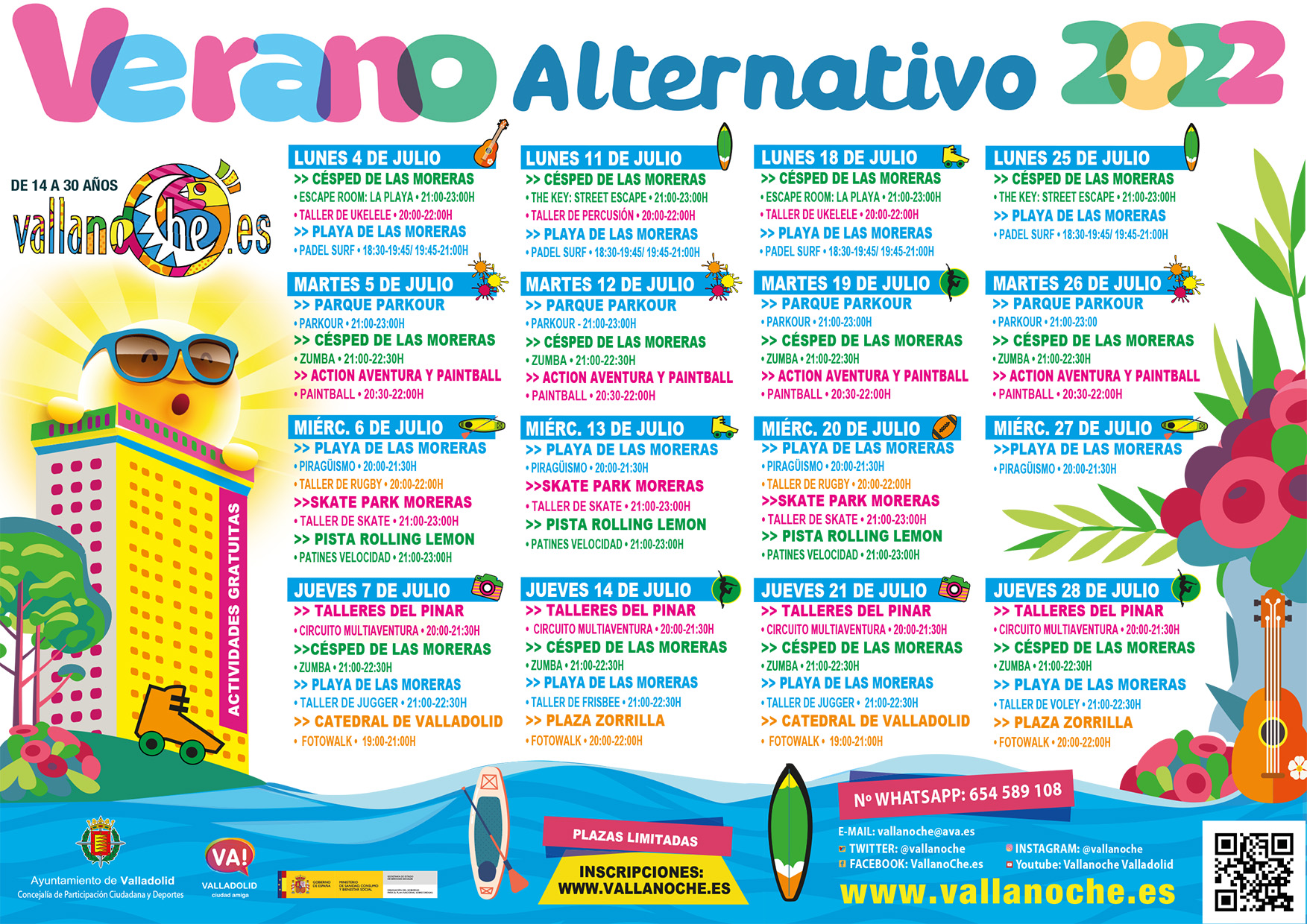 La Concejalía de Participación Ciudadana y Deportes organiza los programas para jóvenes Vallatarde (de 11 a 14 años) y Vallanoche (de 14 a 30 años) con una gran cantidad de variadas actividades de calidad y todas gratuitas, destinadas a fomentar formas de ocio saludable. Esta programación, que se ha convertido en una de las señas de identidad de los fines de semana en la ciudad, presenta ahora su "Verano Alternativo 2022" que comenzará el próximo lunes, 4 de julio, y se prolongará hasta el día 28 del mismo mes, con 52 actividades diseñadas para Vallanoche y 34 para Vallatarde.