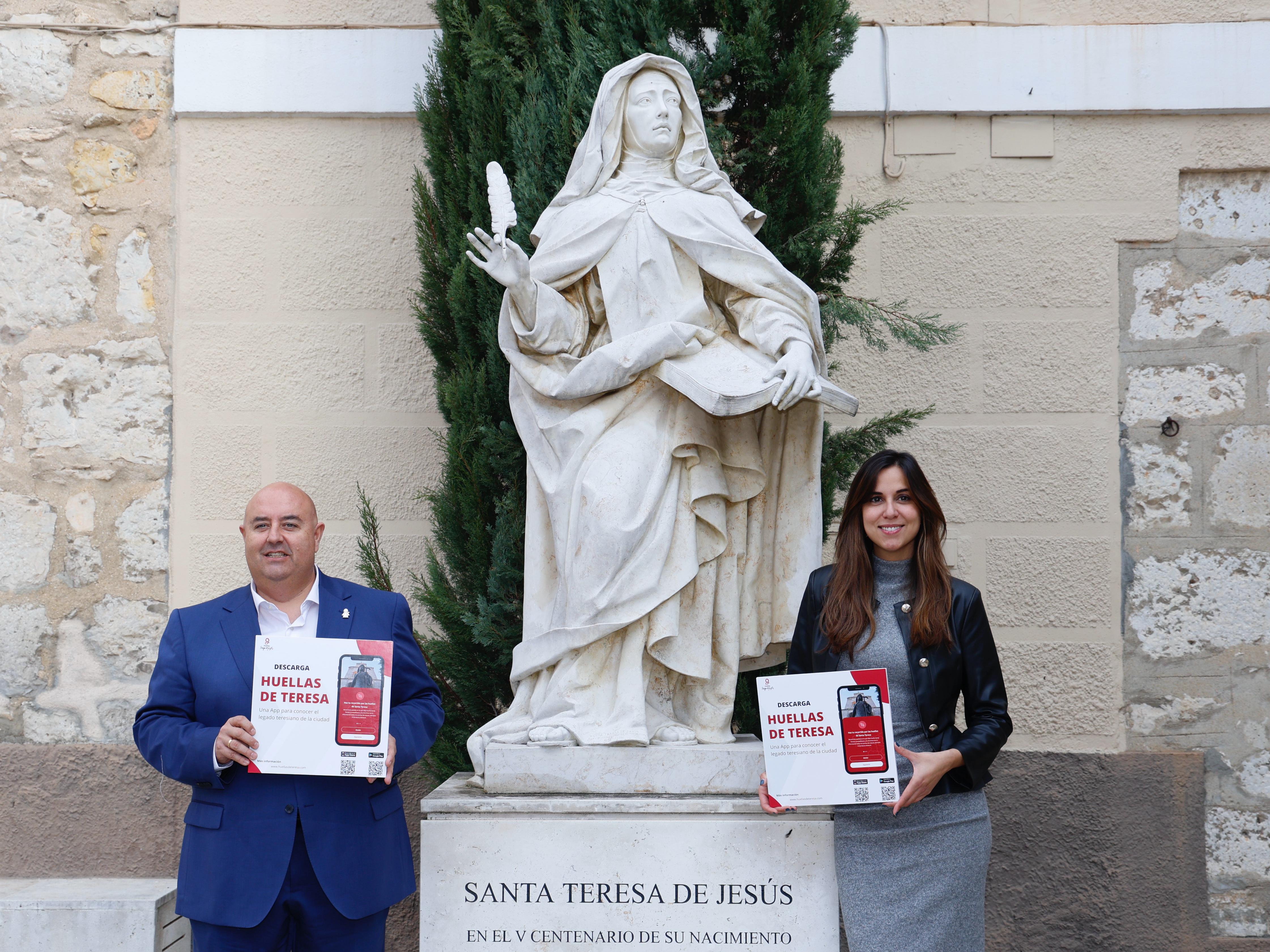 La concejala de Turismo, Eventos y Marca Ciudad de Valladolid, Blanca Jiménez, y el concejal de Turismo de Ávila y coordinador de Huellas de Teresa, Carlos López, han presentado hoy en Valladolid, cuarta fundación teresiana, en el Convento de Santa Teresa de las M.M. Carmelitas Descalzas, la Aplicación (App) Móvil de la Red Huellas de Teresa, un proyecto que ofrece a los usuarios la posibilidad de guiarles en las ciudades teresianas para conocer el legado teresiano que albergan.
