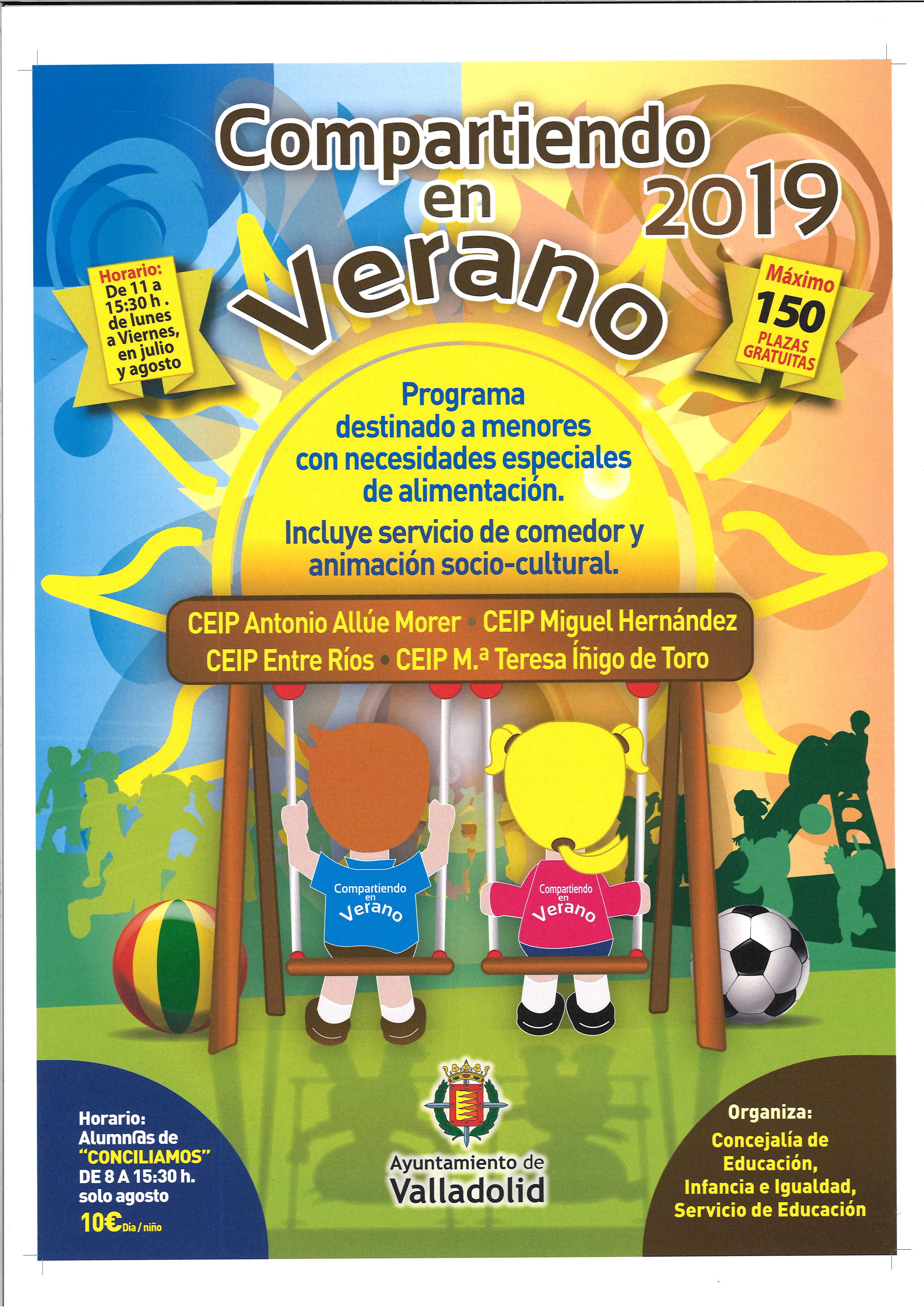 • Comienza el plazo de solicitudes para el programa de comedores escolares “Compartiendo en verano 2019”Por quinto año consecutivo, la Concejalía de Educación, Infancia e Igualdad del Ayuntamiento de Valladolid, que dirige María Victoria Soto, pone en marcha durante los meses de julio y agosto el programa de comedores escolares "Compartiendo en verano" en cuatro...